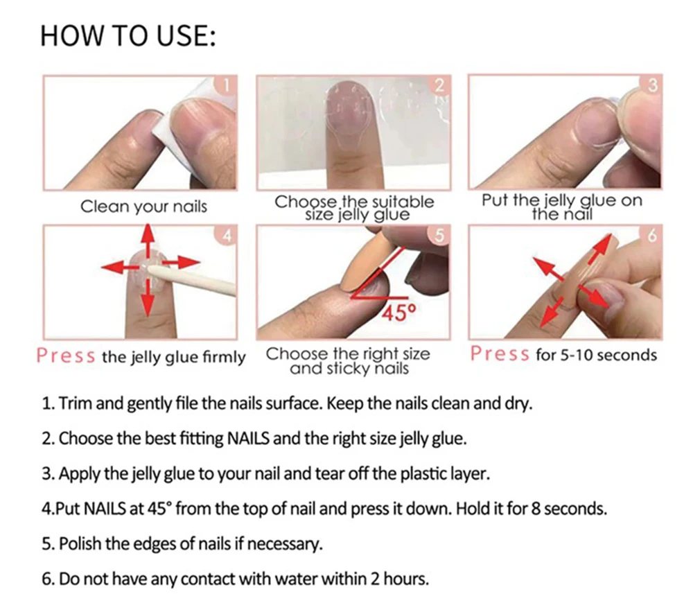 Package contains: 24 pcs nails in a box with plastic tray+ 24 Jelly Tabs+ 1 Mini file+ 1 stick