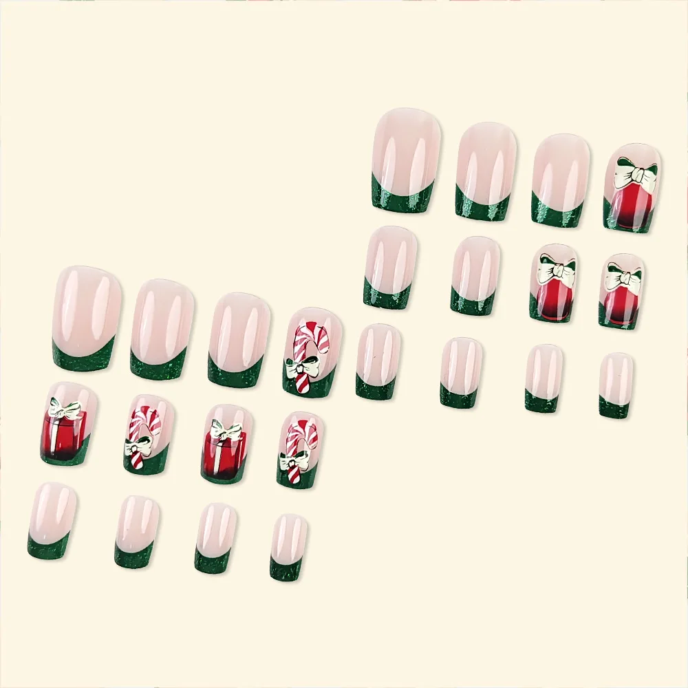 24pcs Christmas Holiday Themed Medium Square Fake Nails Pink Red & Green Glossy Press-On Nails Set Reusable Fake Nails for Women
