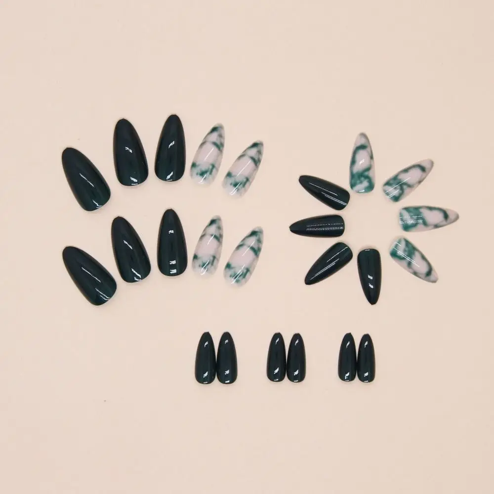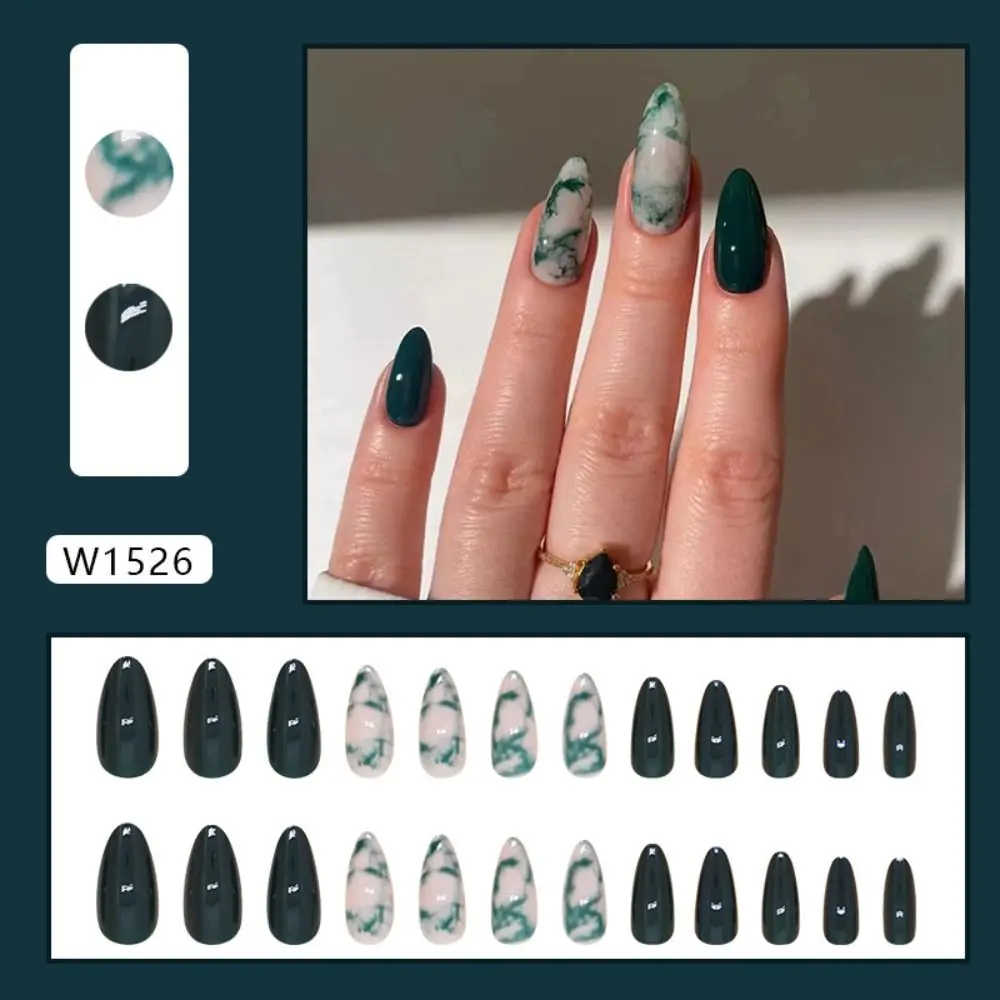 24pcs Long Almond False Nails French Rose Cat Eye Dark Green Swoosh Stars Press on Nails Fake Nails DIY Manicure Detachable