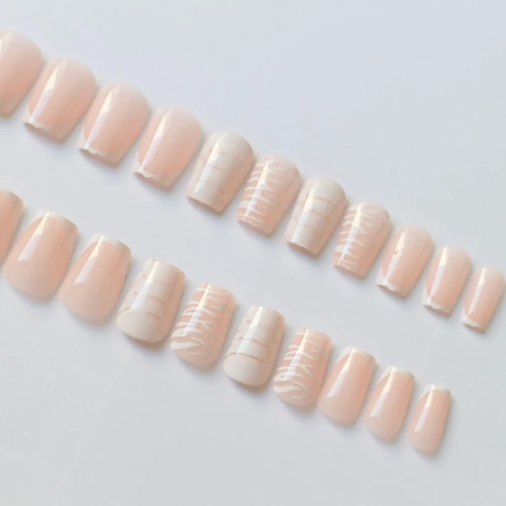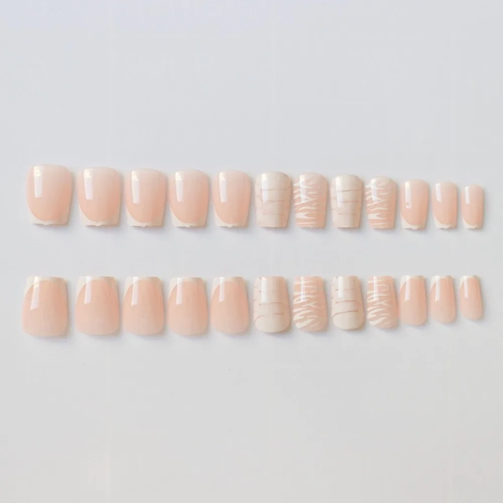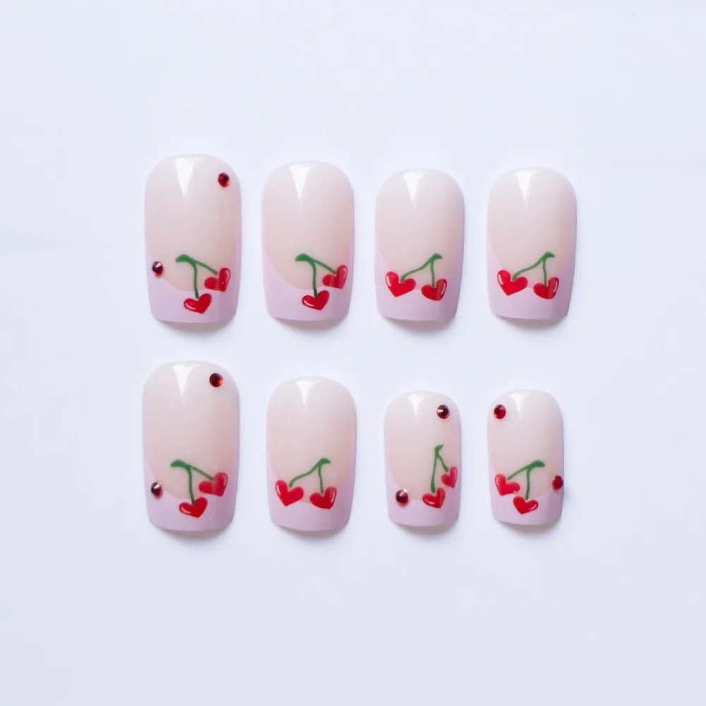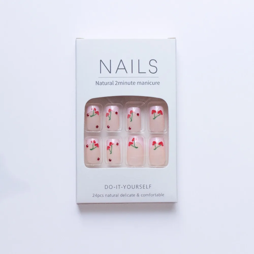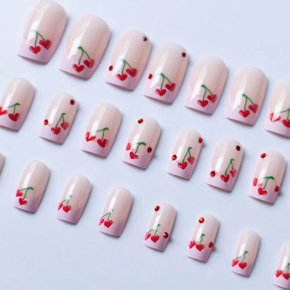 24pcs Short Square False Nails French Cherry Pink Edge Fake Nails Full Cover Nail Tips Press on Nails Faux Fingernails
