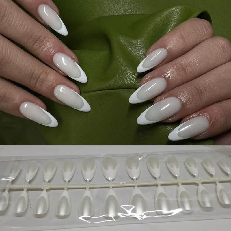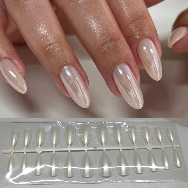 24pcs White Pearl Press on Nails without Glue French False Nails Tip Long Oval Ballet Fake Tips Extension Manicure Decoration