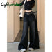 American Black Loose Denim Flare Pants Full Length Vintage Wide Leg Y2k Jeans High Waist Women Ruched Trousers Grunge
