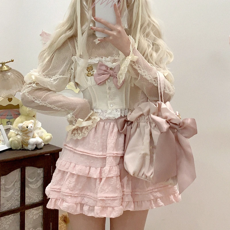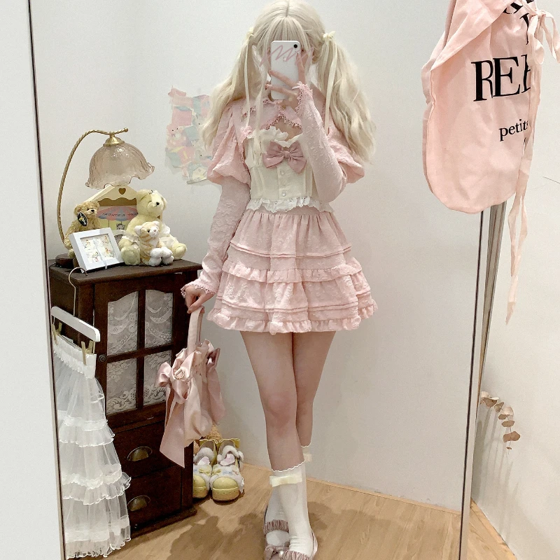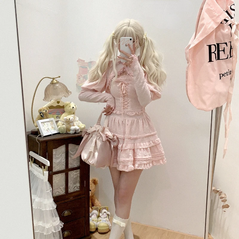 Autumn Kawaii Lolita Style Pink Skirt Sets Women Sweet Lace Bandage Tank Top Cute Mini Cake Skirt Chic Jacquard Relief Rose Suit