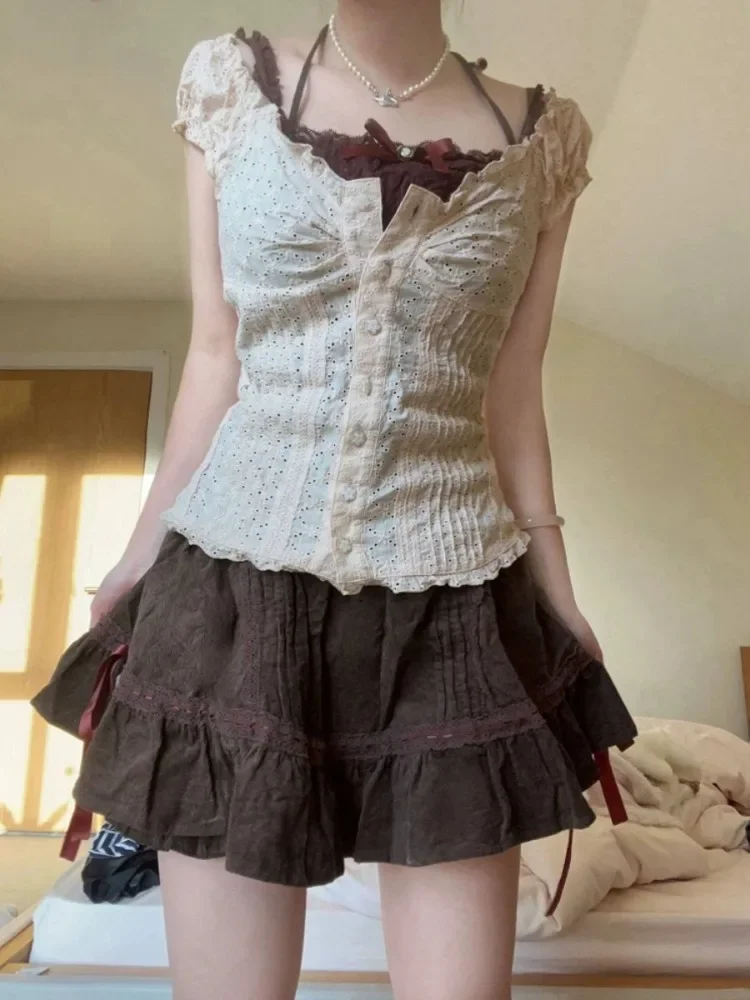 Bow Japanese Kawaii 2 Piece Set Women Sweet Party Y2k Retro Ruched Dresst Suit Female Korean Style Lace Up Chic Set Summer 2024
