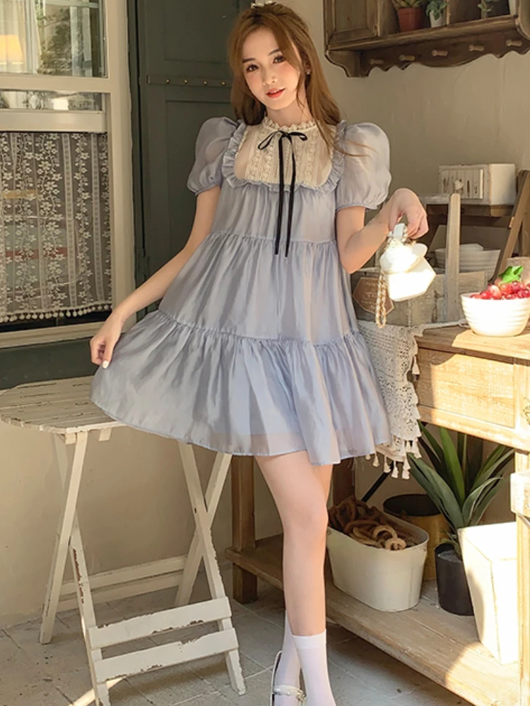 Bubble Sleeve Japanese Kawaii Dress Women Chiffon Elegant Sweet Party Mini Dress Female Lace-up Causal Fairy Dress Summer