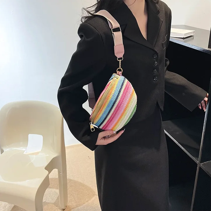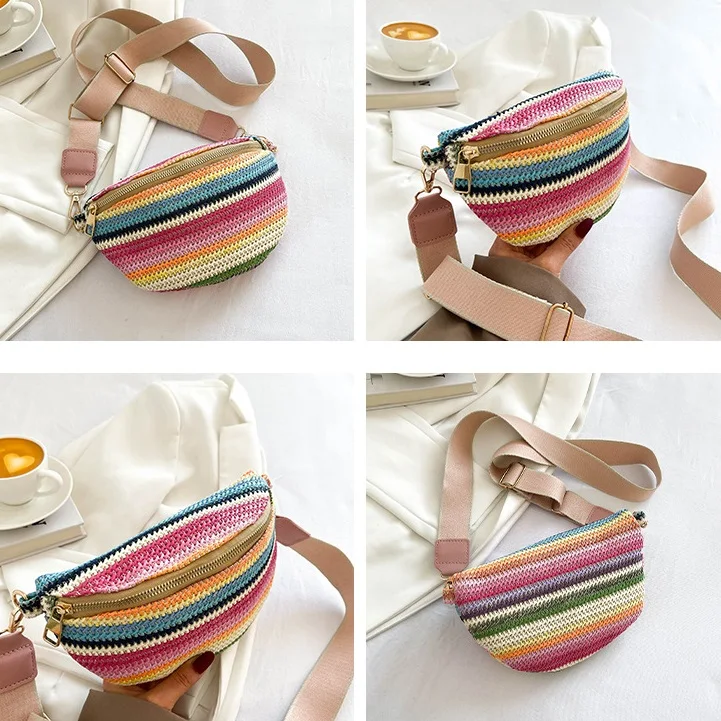 Colourful Stripe Straw Braid Waist Packs For Women Woven Design Waist Bag Lady Casual Travel Fanny Pack Wide Strap Crossbody Bag