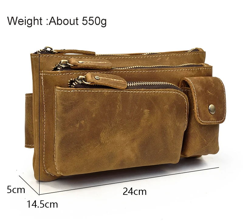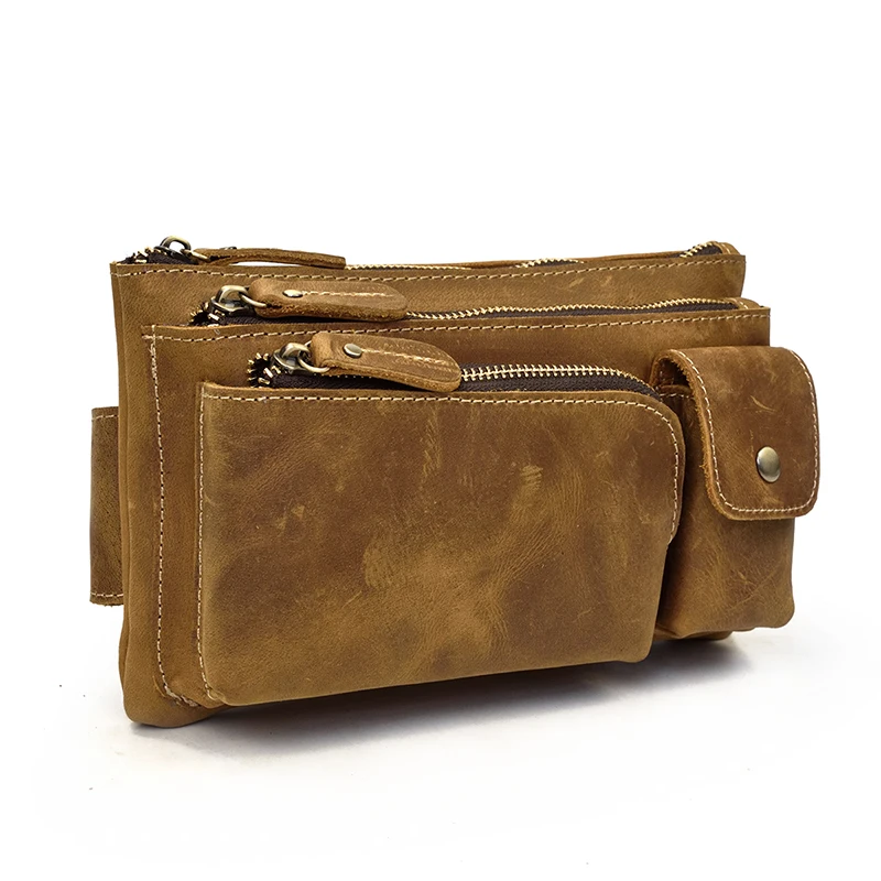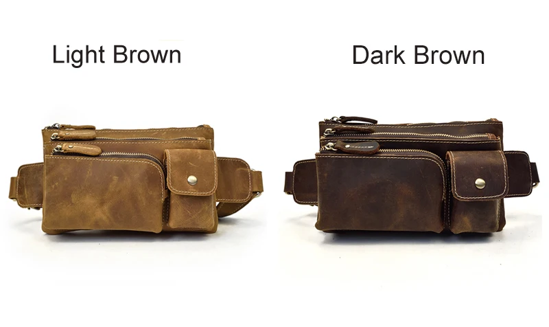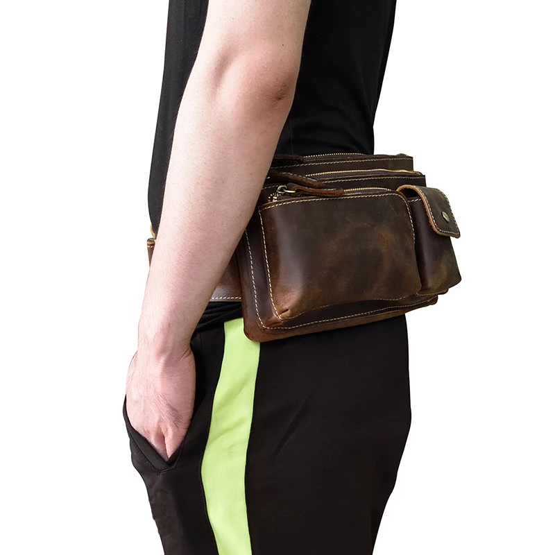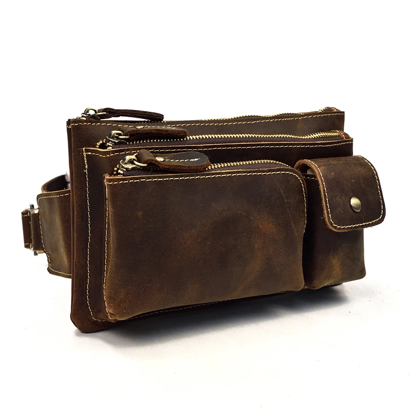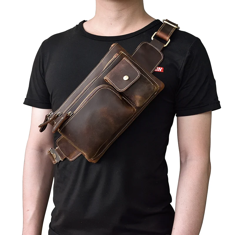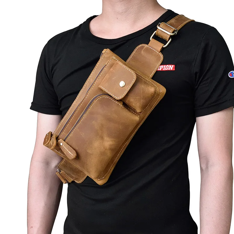 Crazy Horse Men Waist Bag Real Leather Chest Bag Outdoor Casual Full Grain Leather Porable Gym Bags Messenger Bag Brown