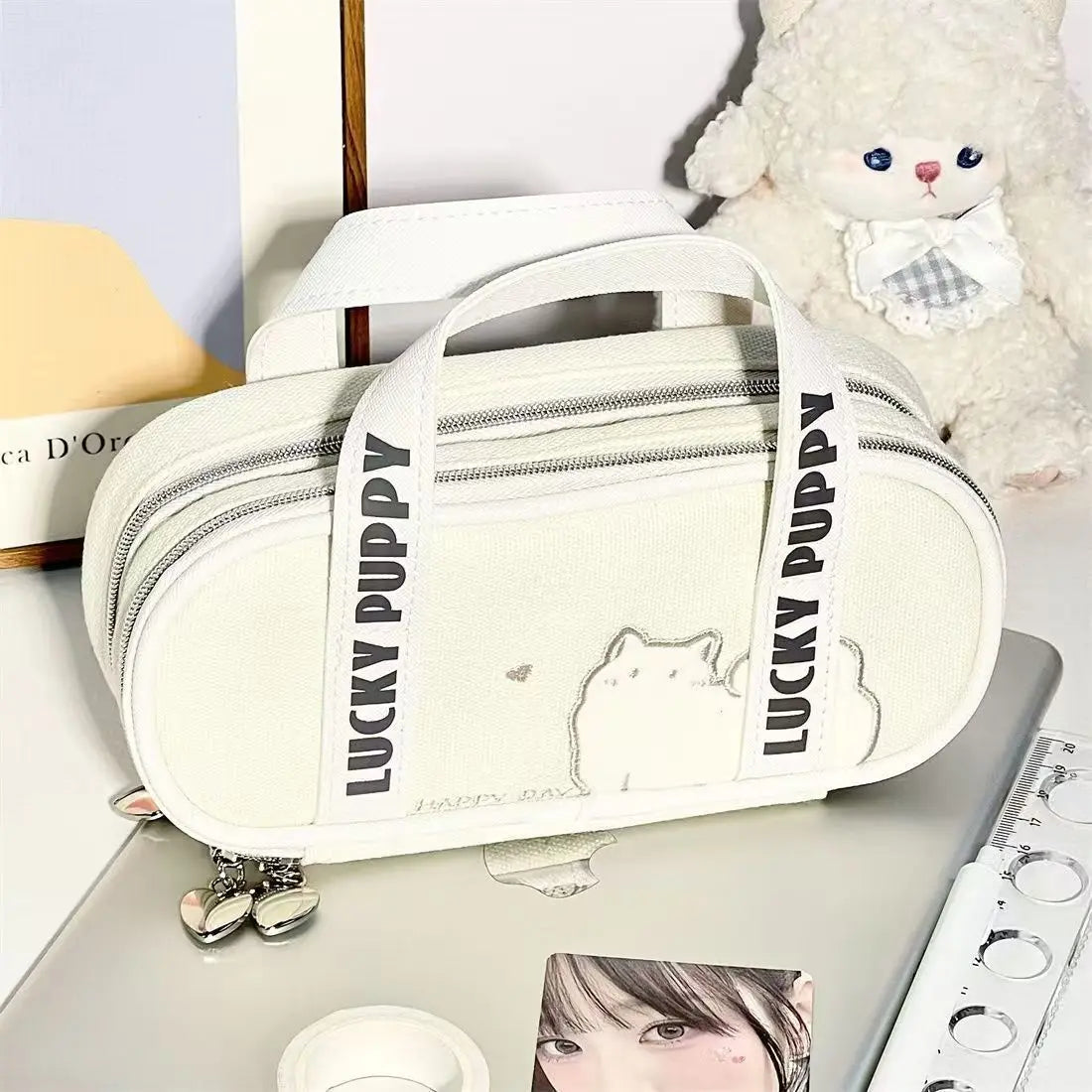 Cyflymder 1 Piece Cute Simplicity Kitten Pencil Case for Kids Beige Color Cat Puppy Pencil Pouch Large Capacity Stationery Storage Bag