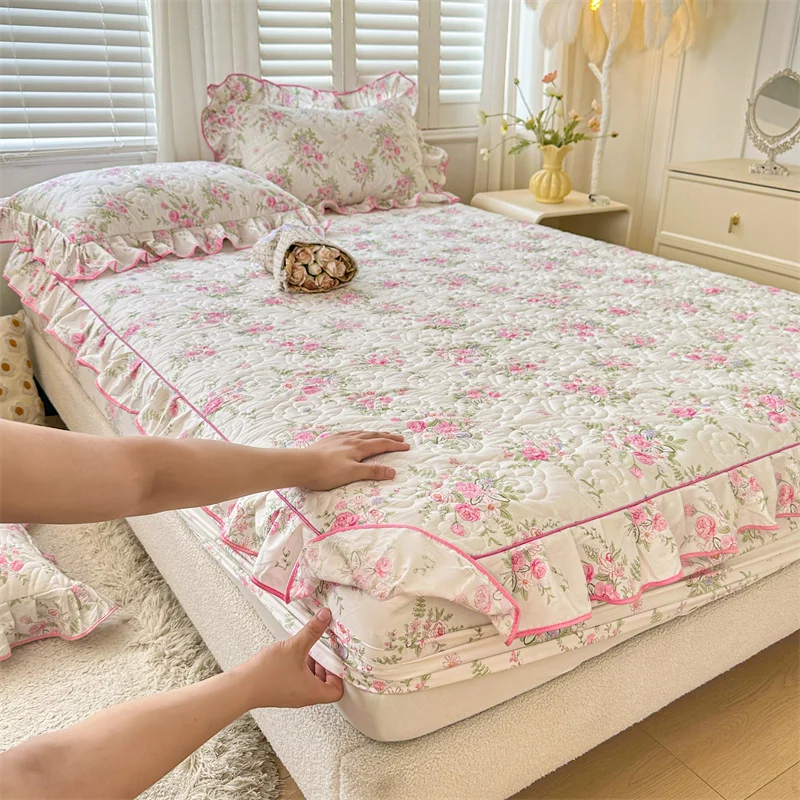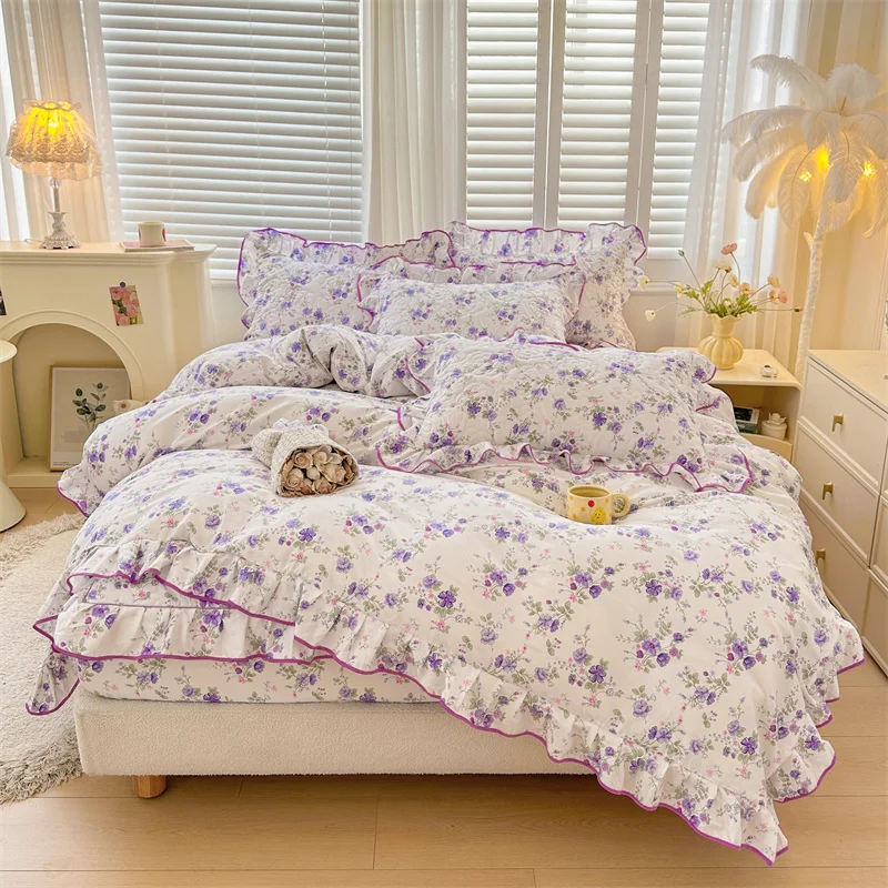 Cyflymder 100% Cotton Korean Princess Style Flowers Print Ruffles Bedding Set Single Duvet cover Quilted Fitted Sheet Pillowcases 3/4Pcs