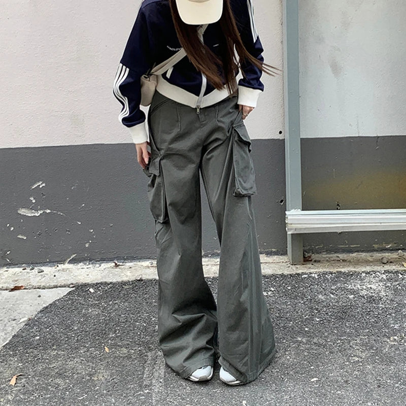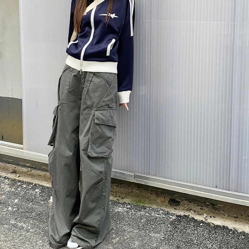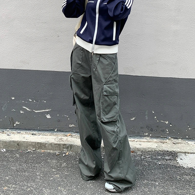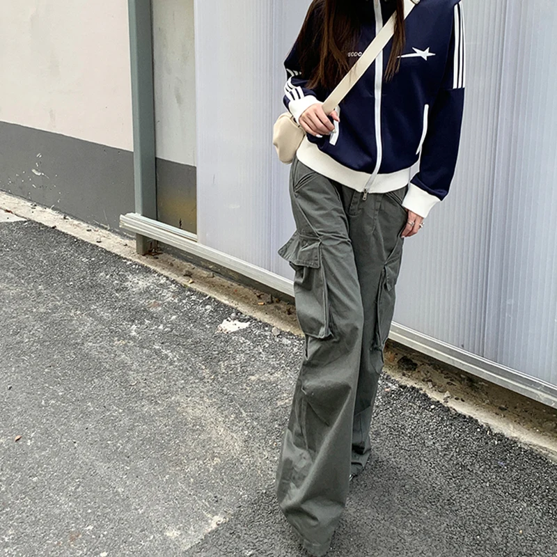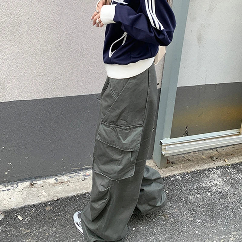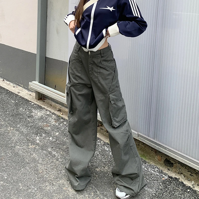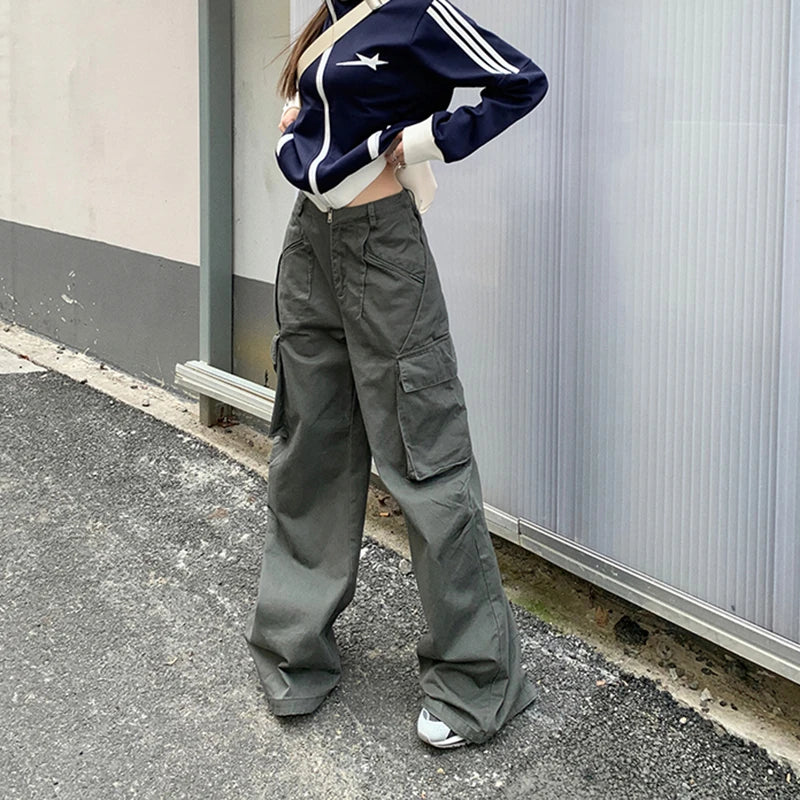 Cyflymder 100% Cotton Women Cargo Pants Loose Y2K Wide Leg Pants Fashion Designed Pockets Female Baggy Trousers New