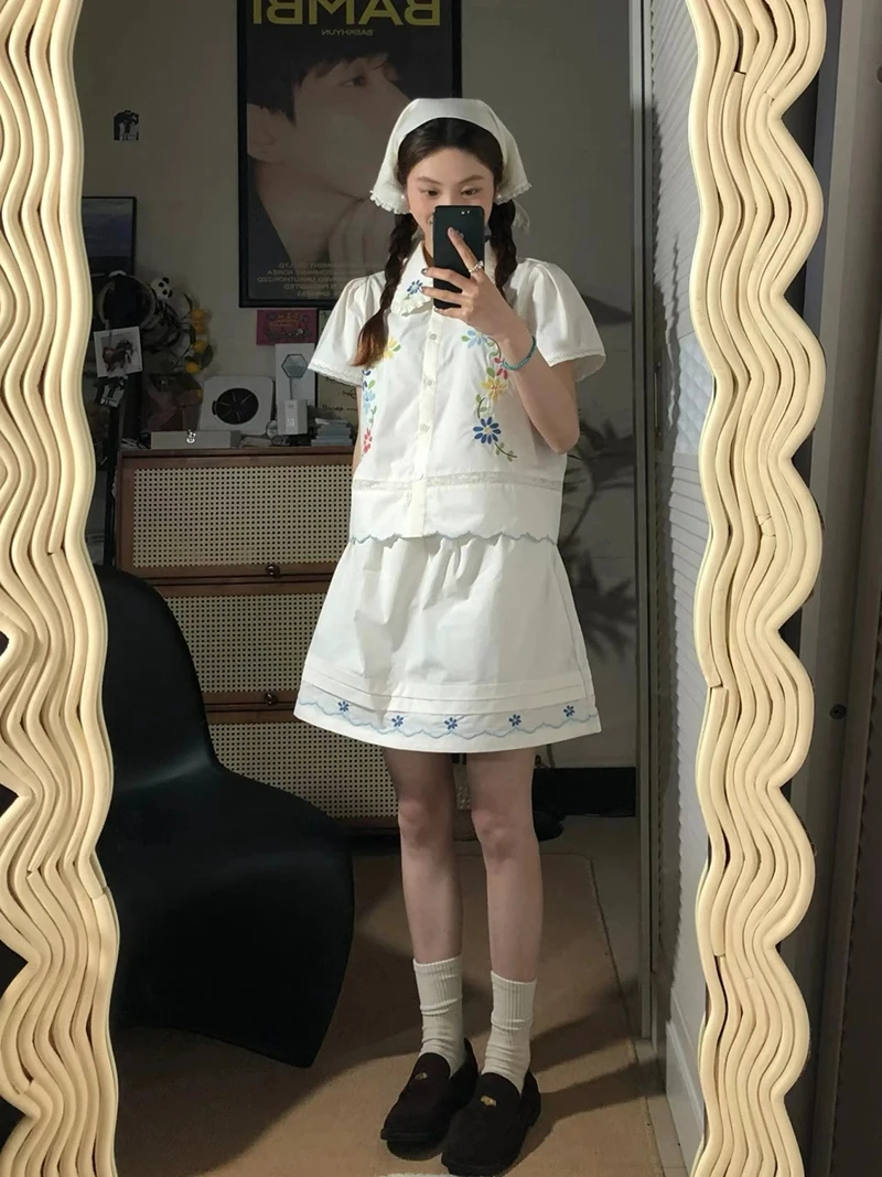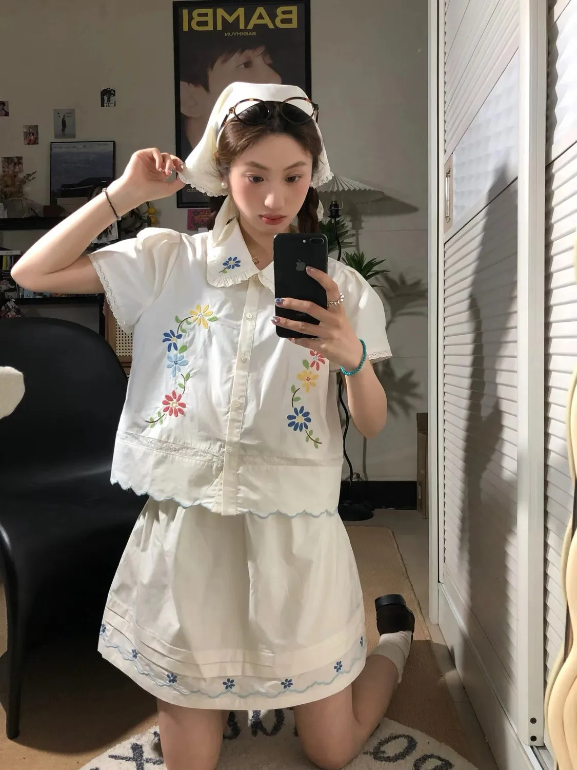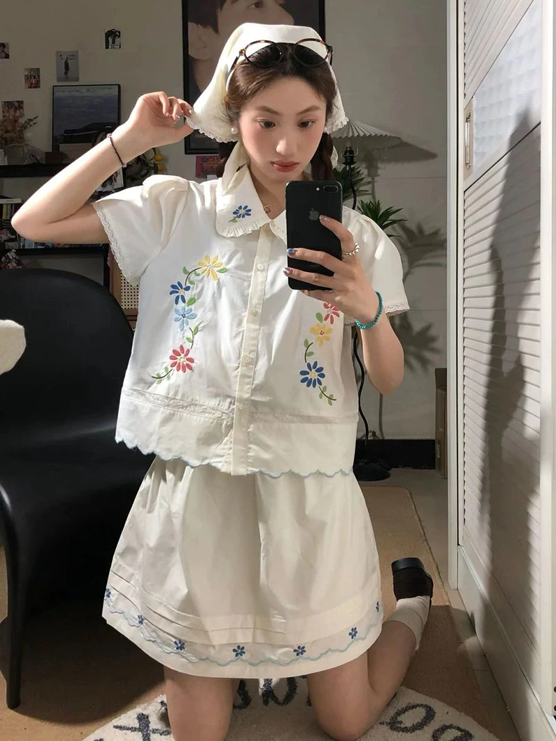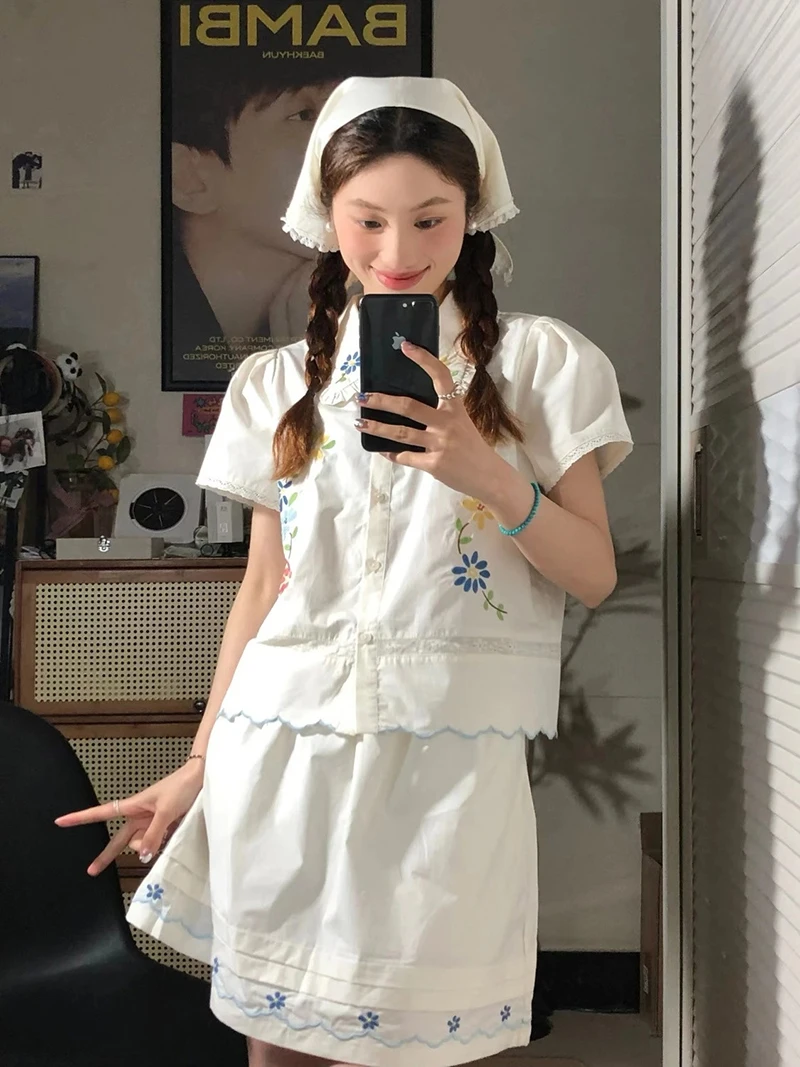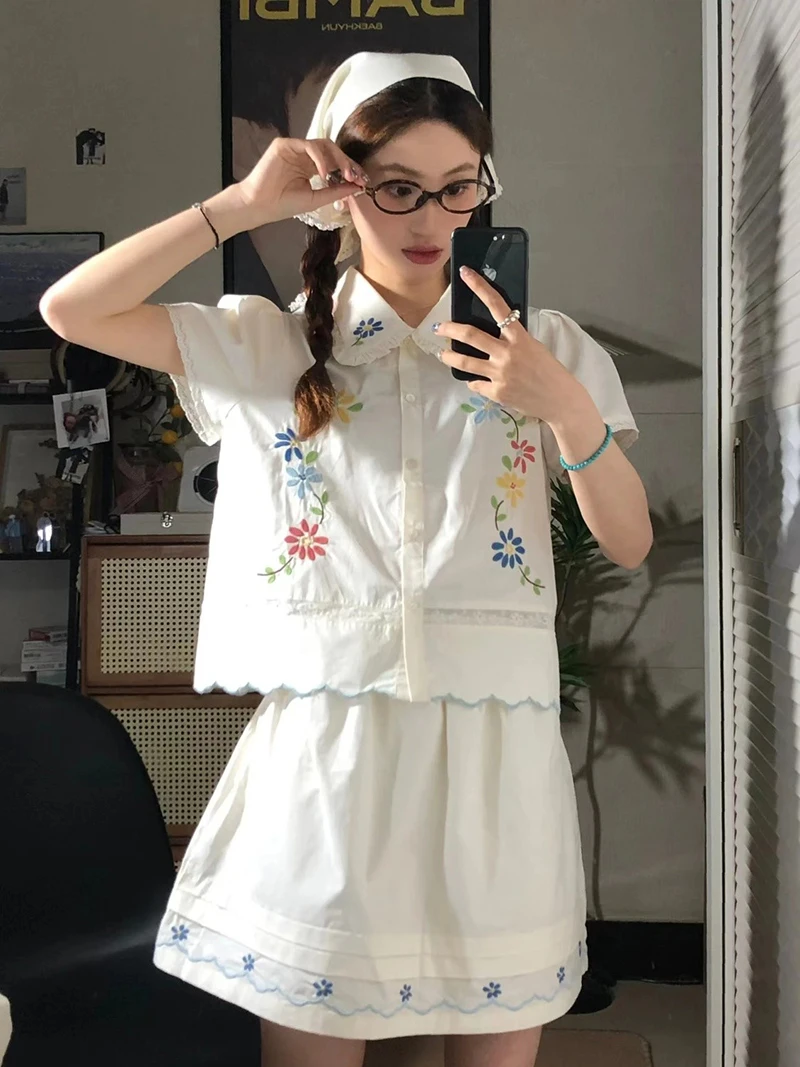 Cyflymder 2 Piece Sets Women Outfit Kawaii Lace Floral Embroidery Short Sleeve Shirts Vintage Cute Mini Skirt Summer New In Matching Sets