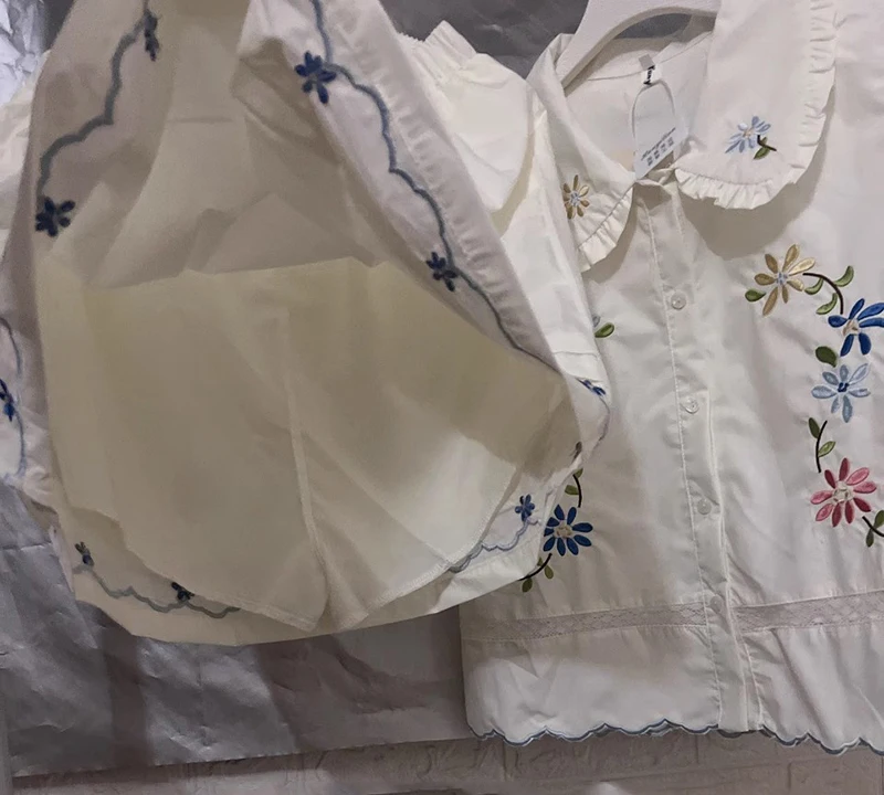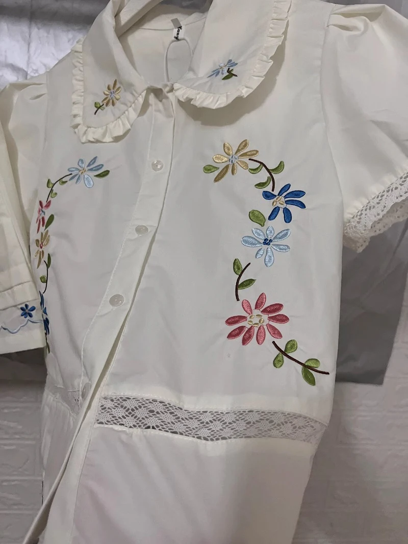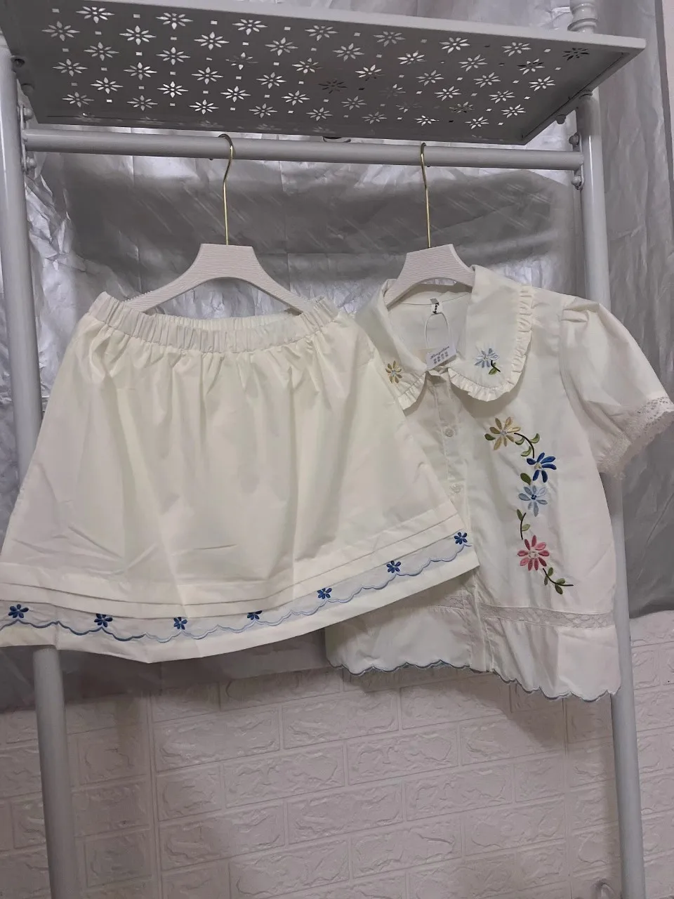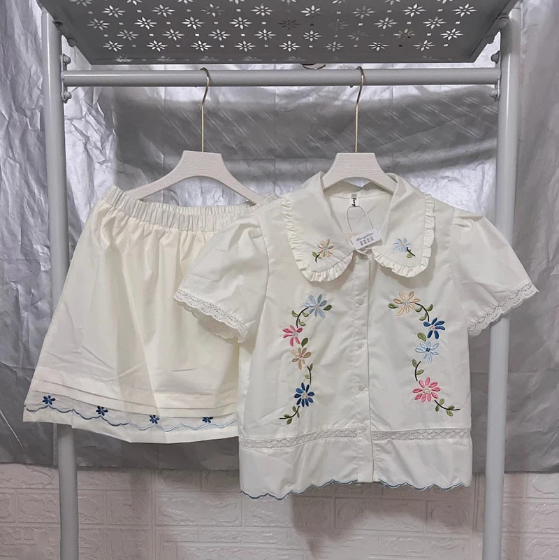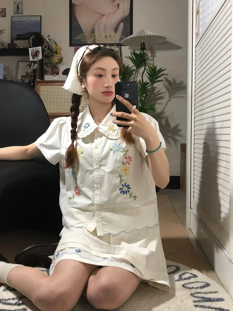 Cyflymder 2 Piece Sets Women Outfit Kawaii Lace Floral Embroidery Short Sleeve Shirts Vintage Cute Mini Skirt Summer New In Matching Sets