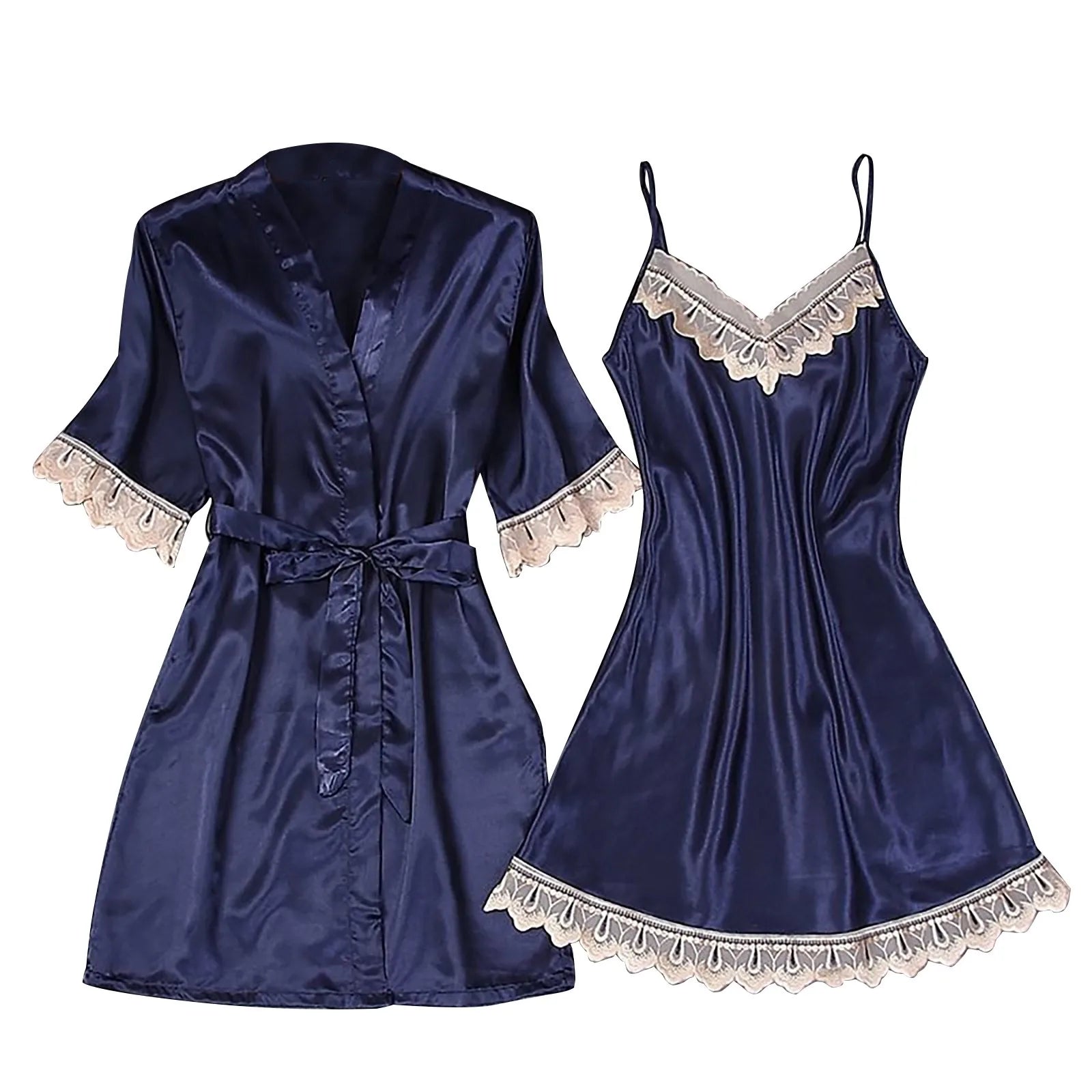 Cyflymder 2-Piece Women Sexy Garter Lingerie Set Robes Lace Splicing Deep V-Neck Nightgown Elegant Fashion Solid Color Retro House Cloth