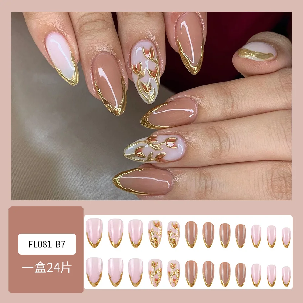 Cyflymder 24pcs Flower Almond Press on Nails False Nails Wearable Stick-on Nails Fake Nail Uñas Postizas Накладные Ногти Faux Ongles 네일팁