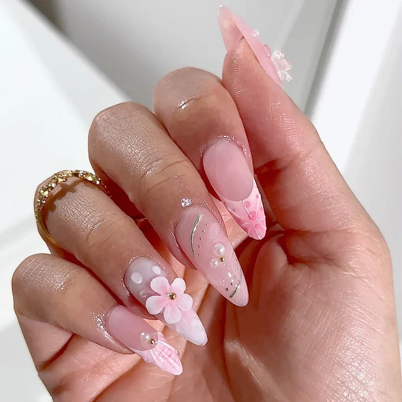 Cyflymder 24Pcs Mid-length Almond False Nails Press on White Polka Dot French Stripe Full Cover Nails Tips Bow Pearl Detachable Fake Nails