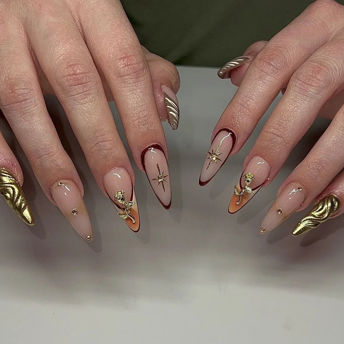 Cyflymder 24Pcs Mid-length Almond Press on False Nails Sun Totem Gilding Design Full Cover Nails Tips Pearl Detachable Finished Fake Nails
