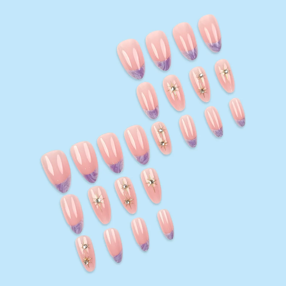 Cyflymder  24pcs Purple French Almond Press on Nails Star Pattern False Nails Wearable Stick-on Nail Fake Nails Uñas Накладные Ногти 네일팁