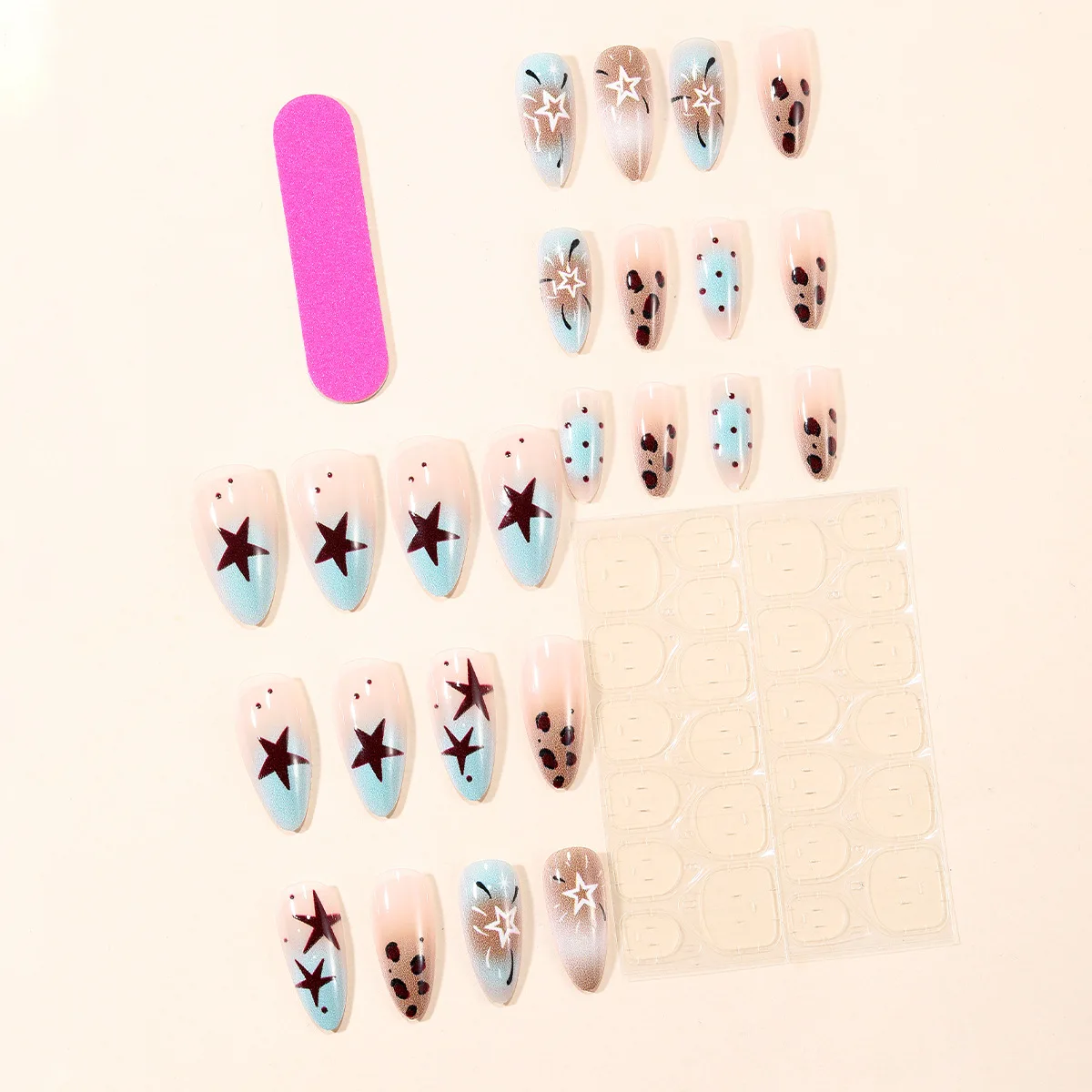 Cyflymder 24pcs Retro Leopard Print Fake Nail Tips y2k Blue French Almond Press on Nail Wearable Spicy Girl False Nails for Women Girls