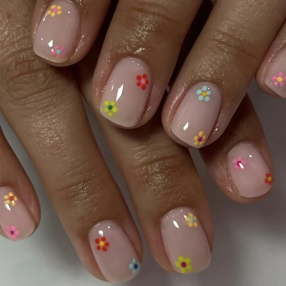 Cyflymder 24Pcs Short Square Head Press on Fake Nails White Daisy Detachable False Nails Pink Smudge Grid Design Full Cover Nails Tips Art