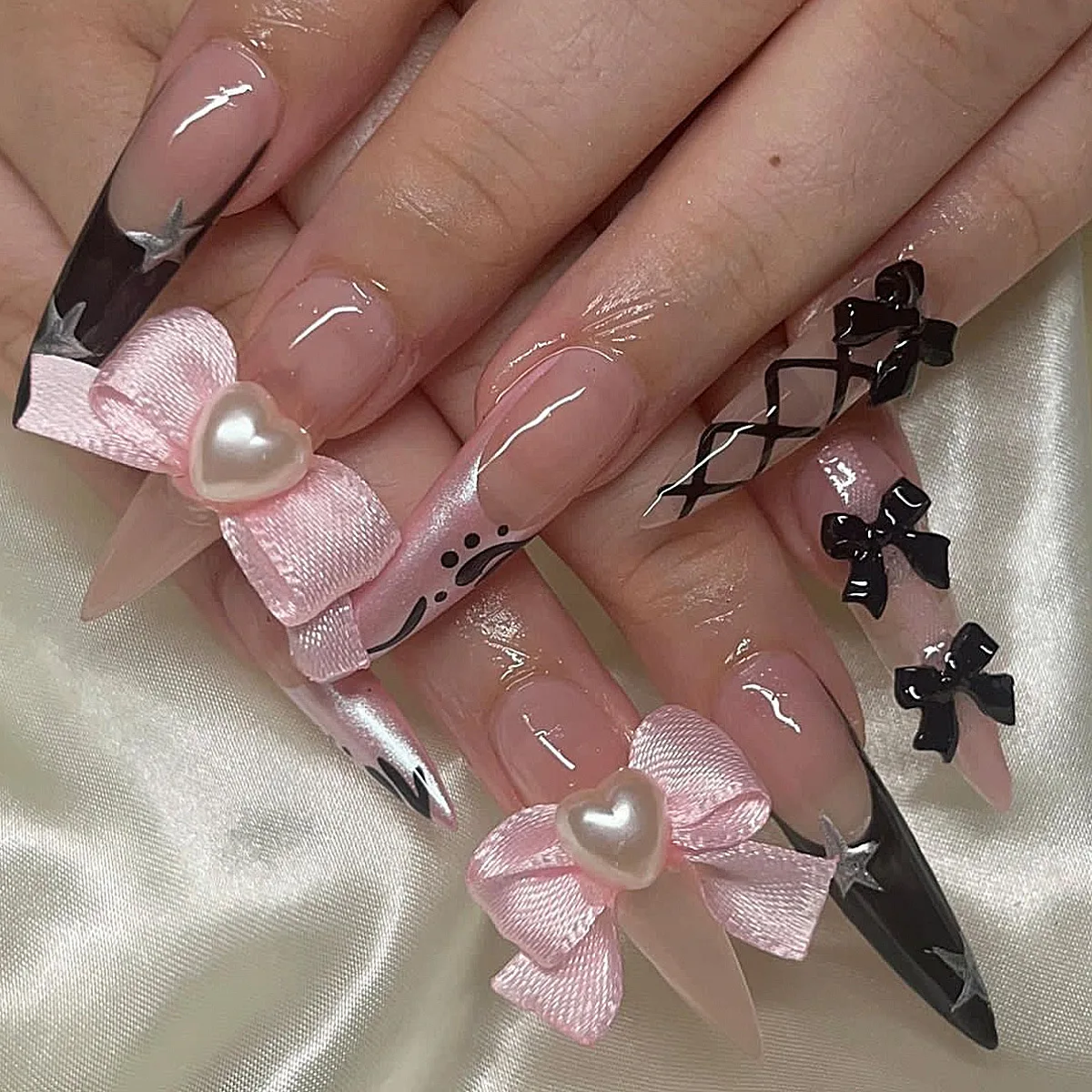 Cyflymder 24Pcs Wine Red Gradient French Press on Fake Nails Long Stiletto Detachable False Nails 3D Bow Pearl Heart Full Cover Nails Tips