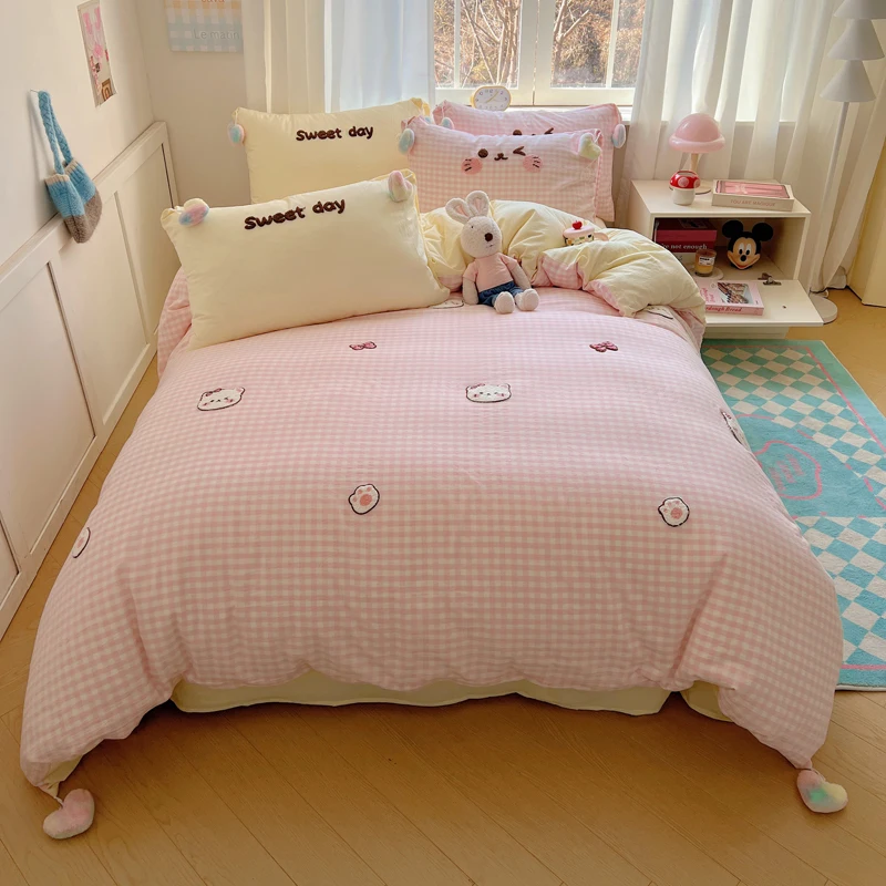 Cyflymder 3/4Pcs Cute Cartoon Cat Embroidery Heart Pompom Bedding Set Single Queen King Size 100% Cotton Duvet Cover Bed Sheet Pillowcases