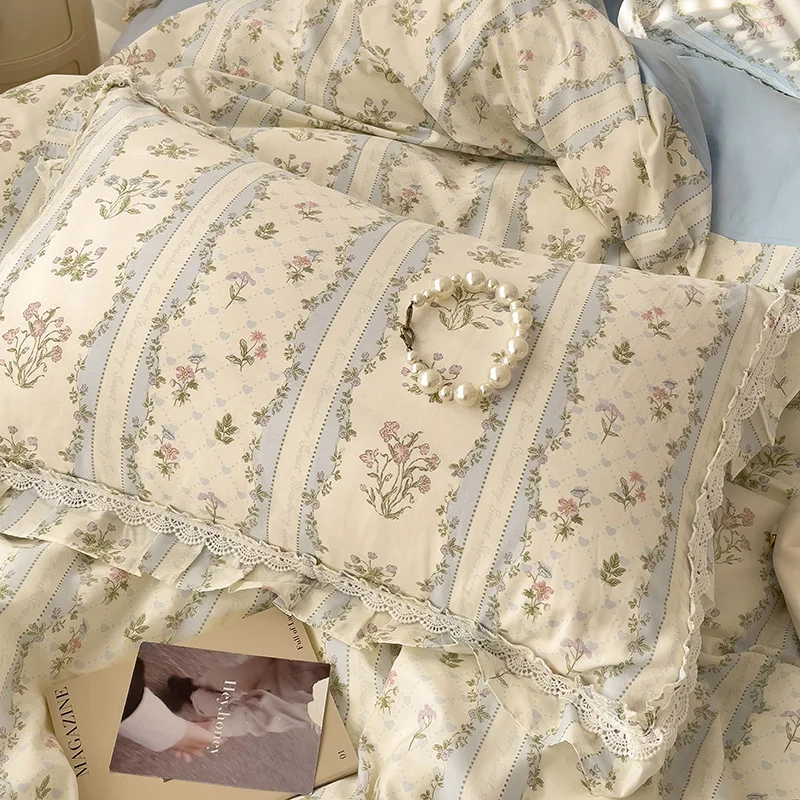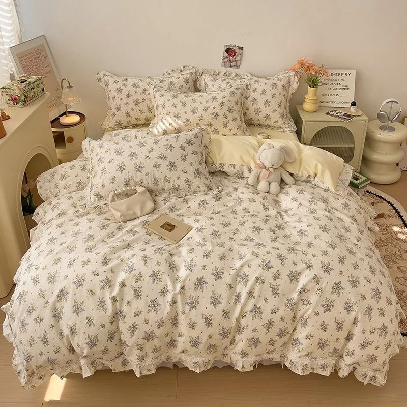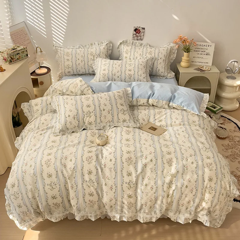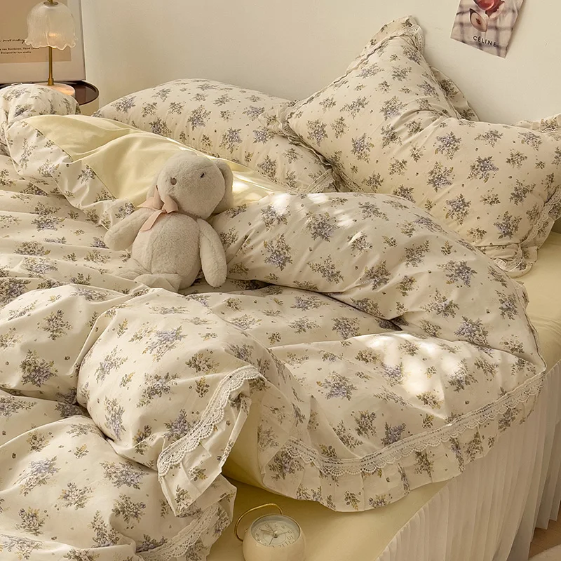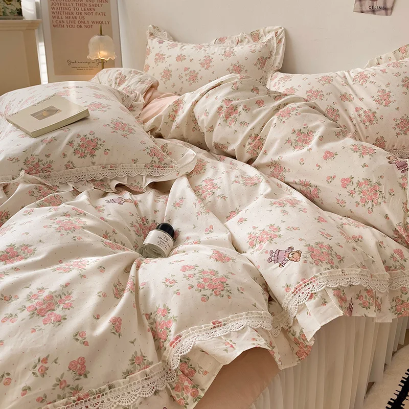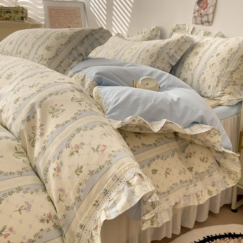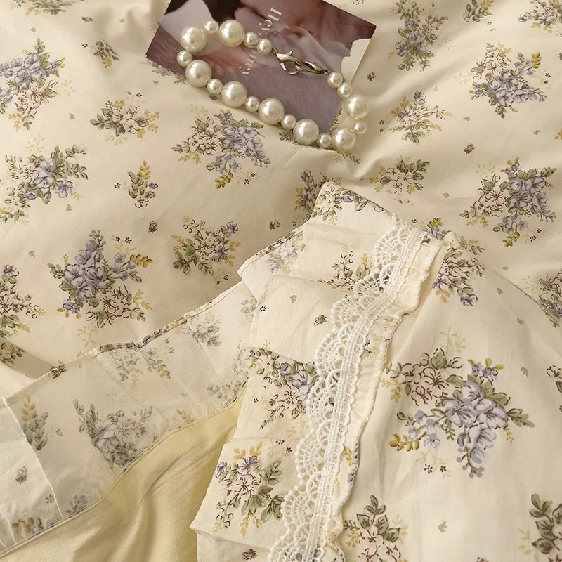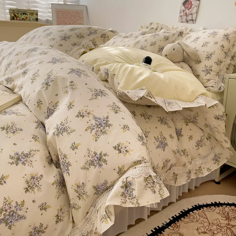 Cyflymder 3/4Pcs Vintage French Fresh Floral Lace Ruffles 100% Cotton Bedding Set Duvet Cover Bed Skirt/Bed Sheet/Fitted Sheet Pillowcases