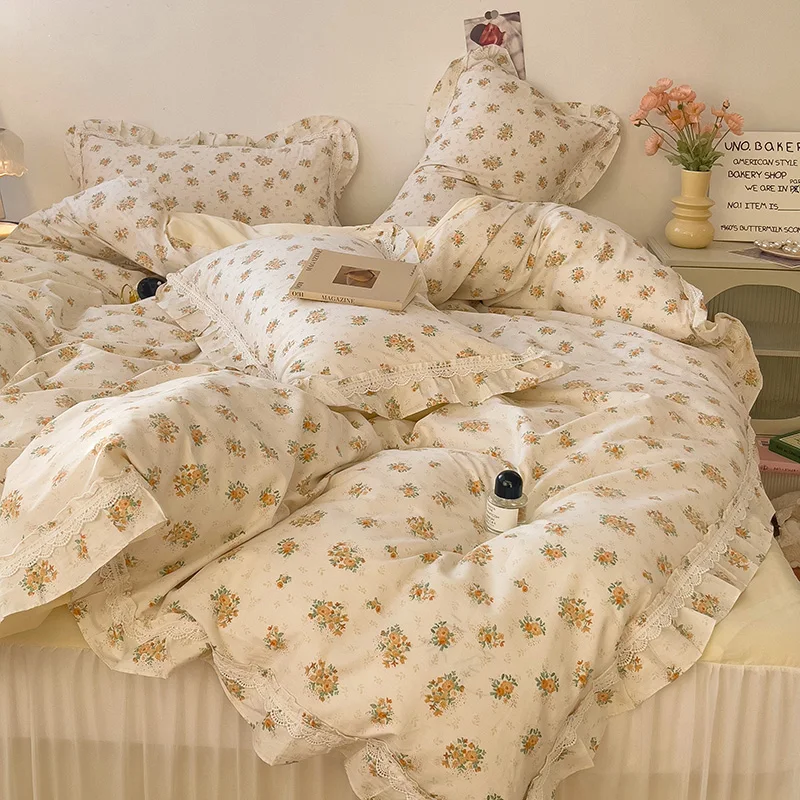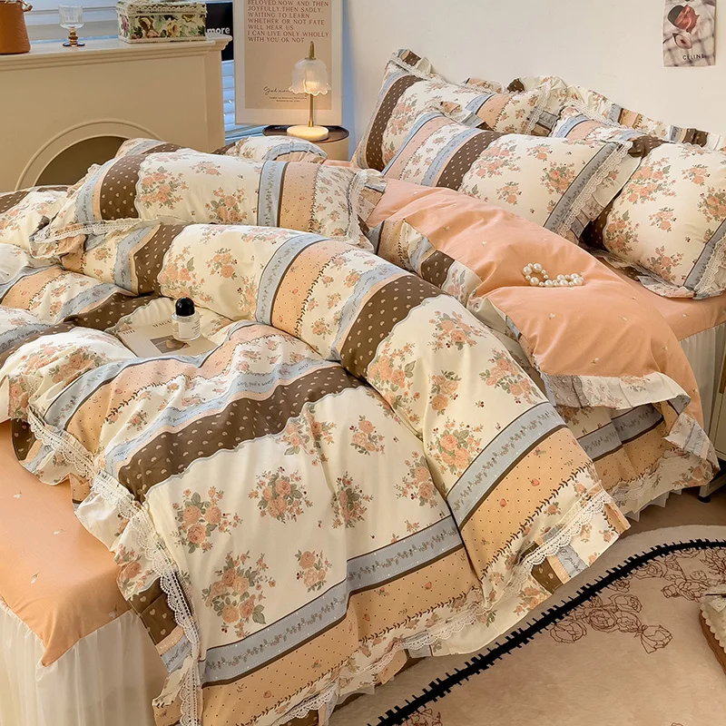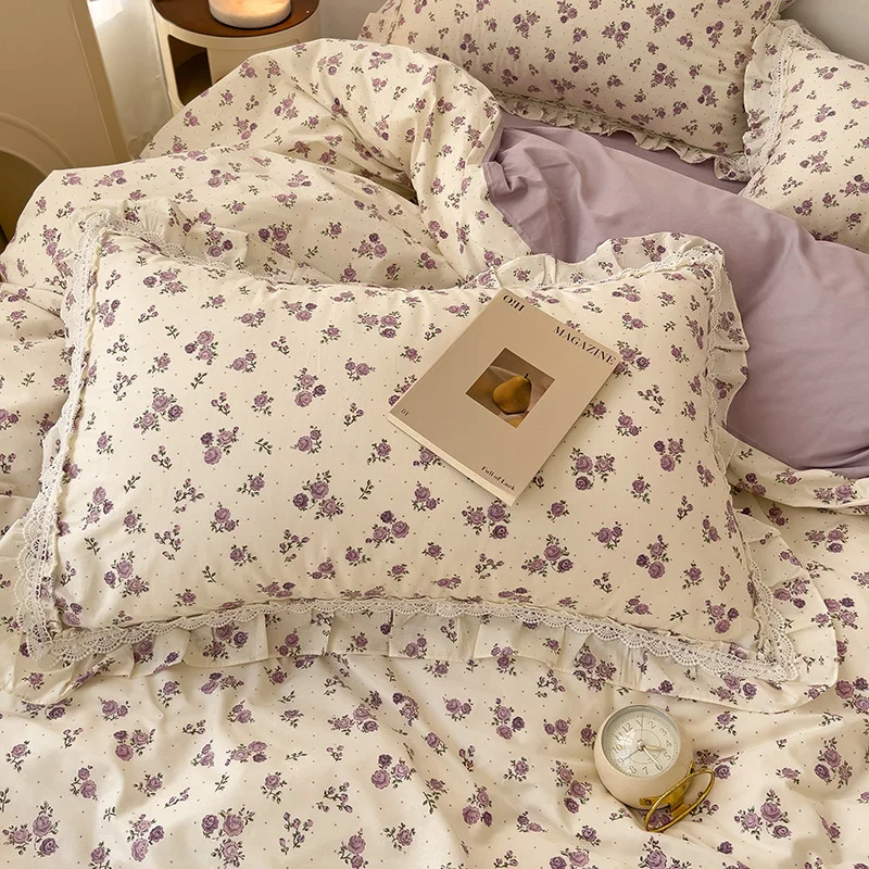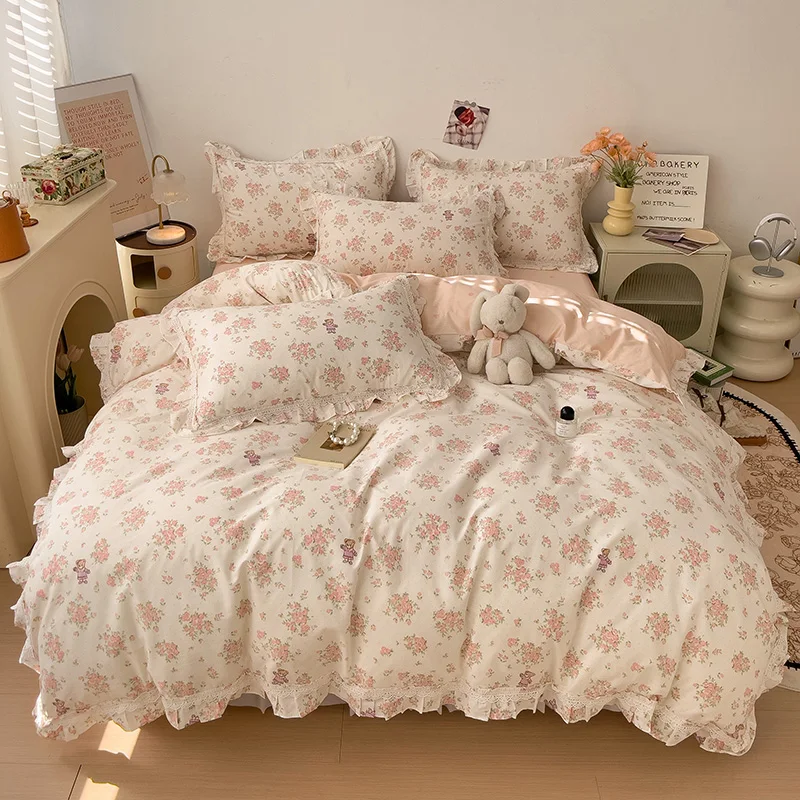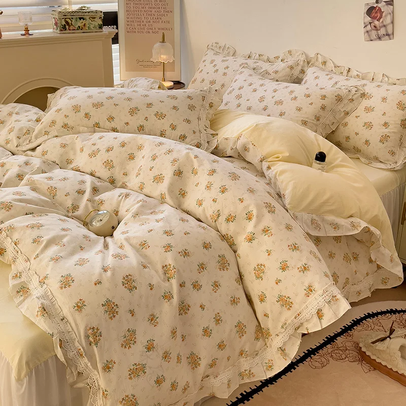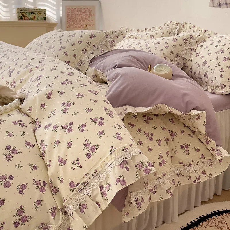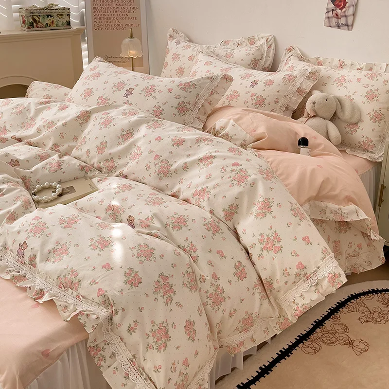 Cyflymder 3/4Pcs Vintage French Fresh Floral Lace Ruffles 100% Cotton Bedding Set Duvet Cover Bed Skirt/Bed Sheet/Fitted Sheet Pillowcases
