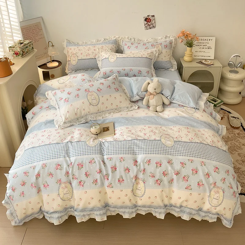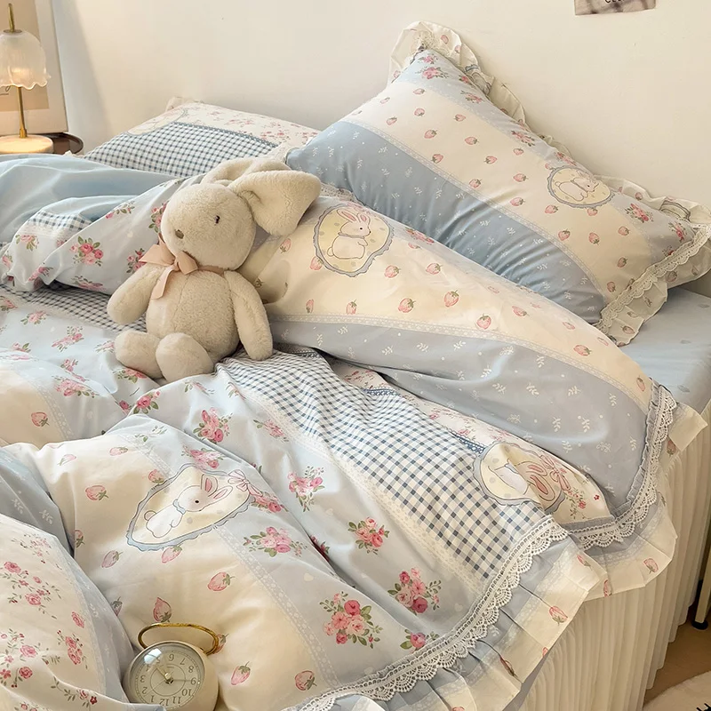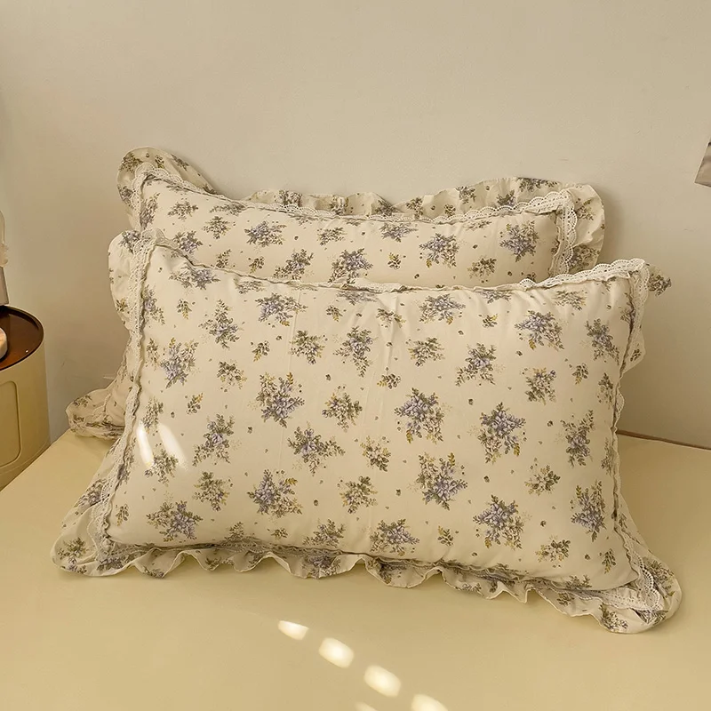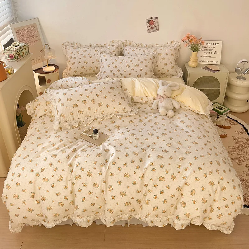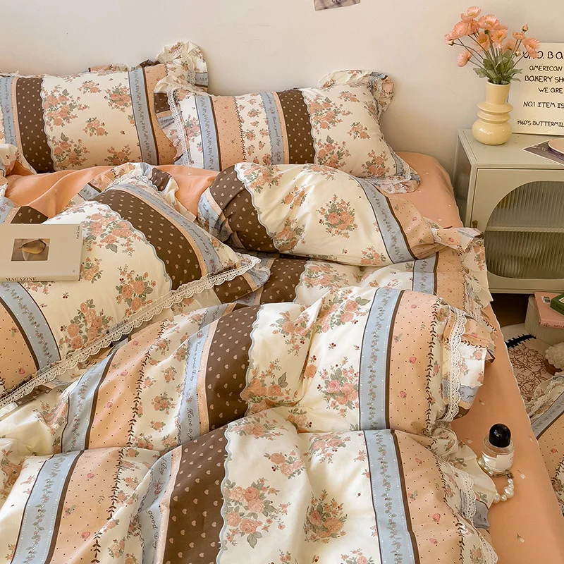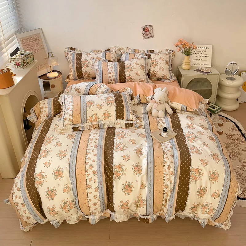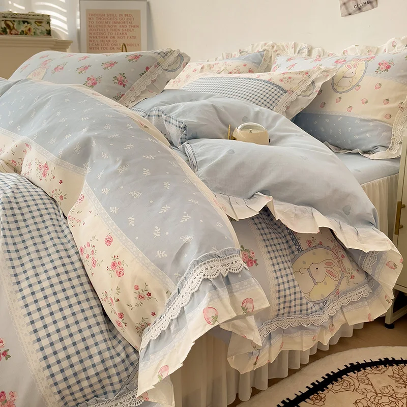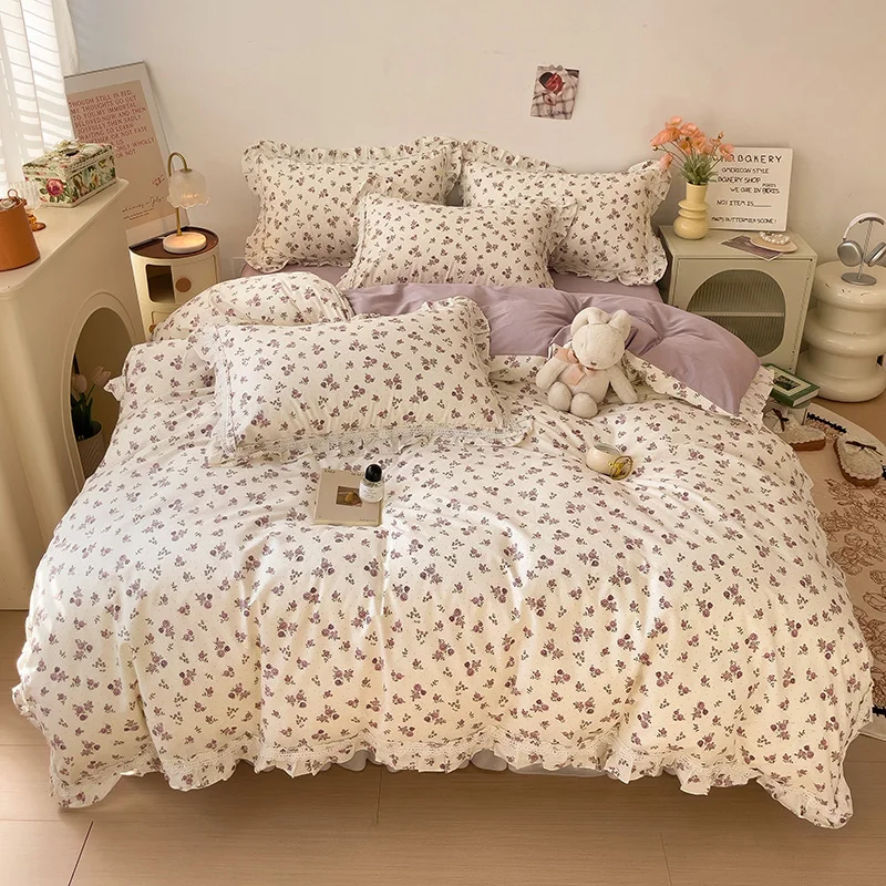 Cyflymder 3/4Pcs Vintage French Fresh Floral Lace Ruffles 100% Cotton Bedding Set Duvet Cover Bed Skirt/Bed Sheet/Fitted Sheet Pillowcases