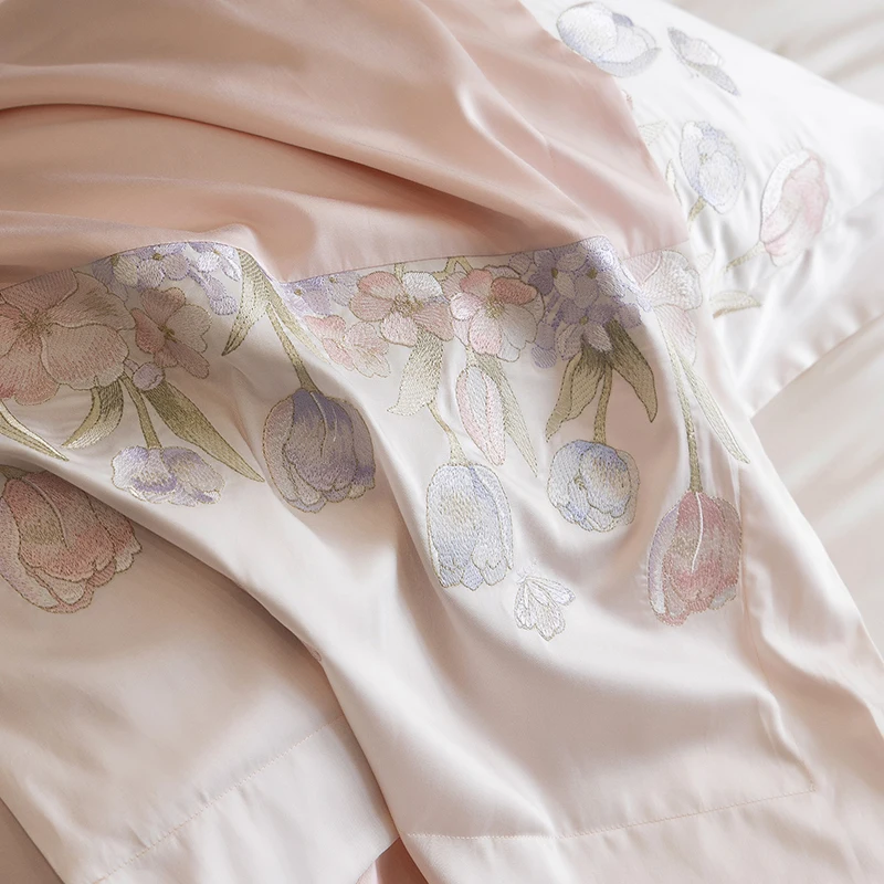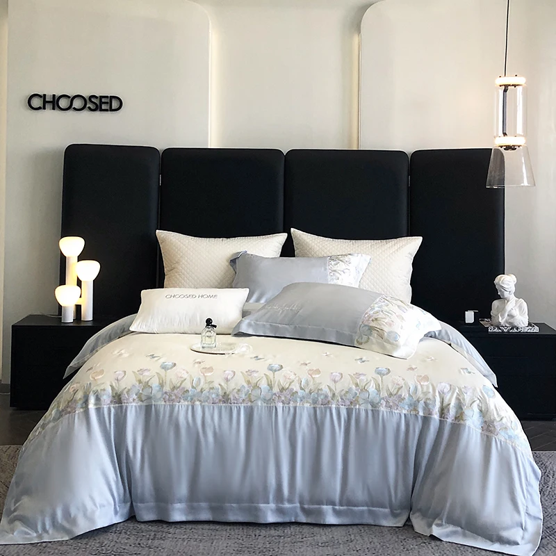 Cyflymder 4Pcs Blue Pink Luxury Butterfly Flowers Embroidery Bedding Set Egyptian Cotton Duvet Cover Bed Sheet/Fitted Sheet Pillowcases