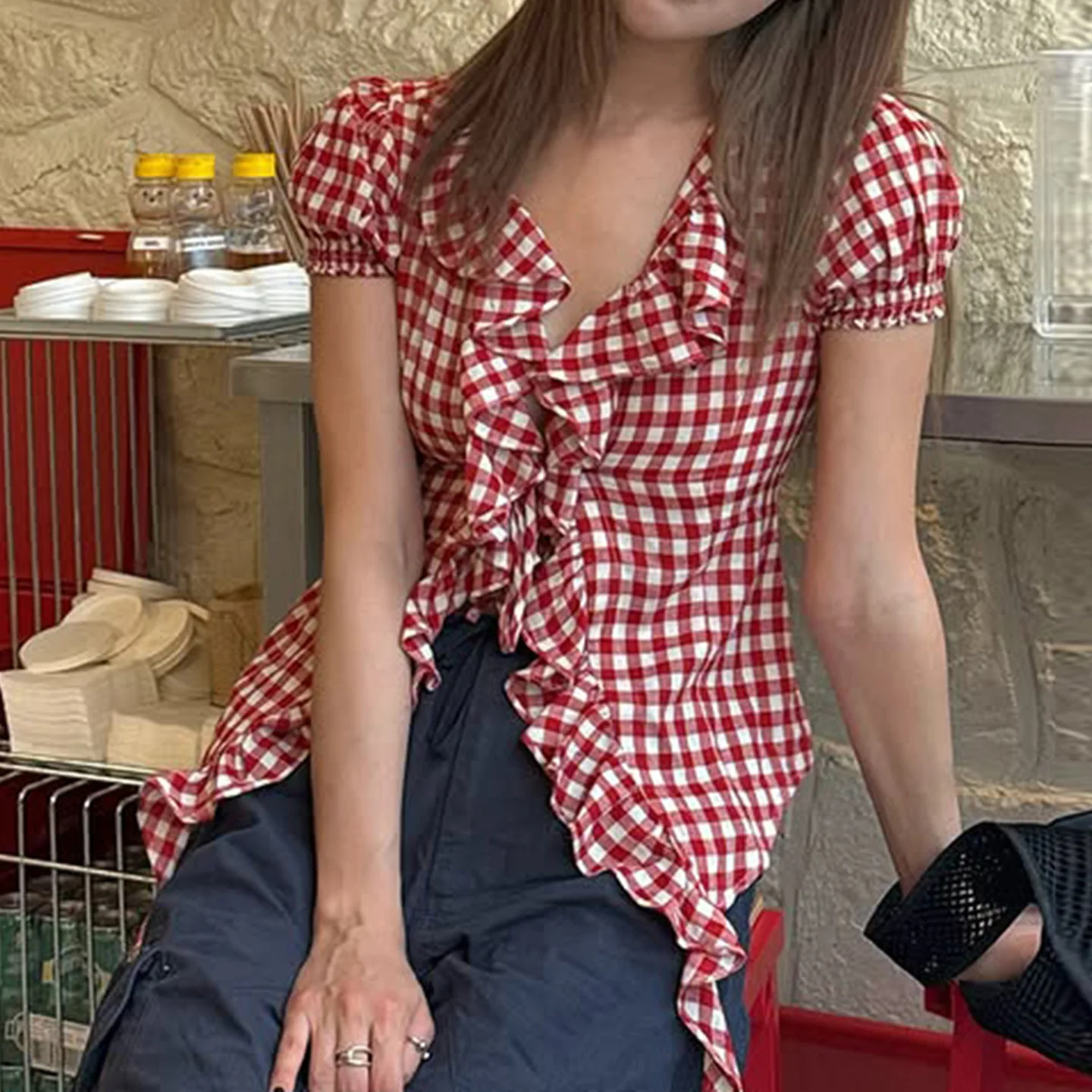 Cyflymder American Sle Vintage Sexy Slim Fit Ruffle ort Sve Women's irt Floral Print Bubble Sve Casual Summer Top