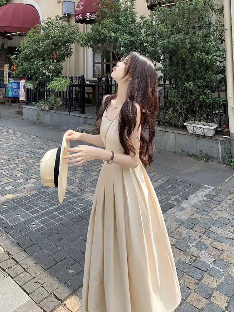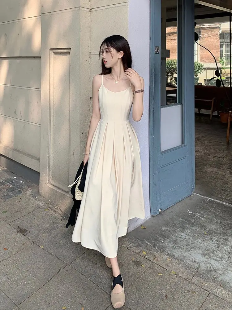 Cyflymder Audrey Hepburn Style Sling Dress Summer New French Style Socialite Elegant Tight Waist Slimming Mid-length Pleated Skirt