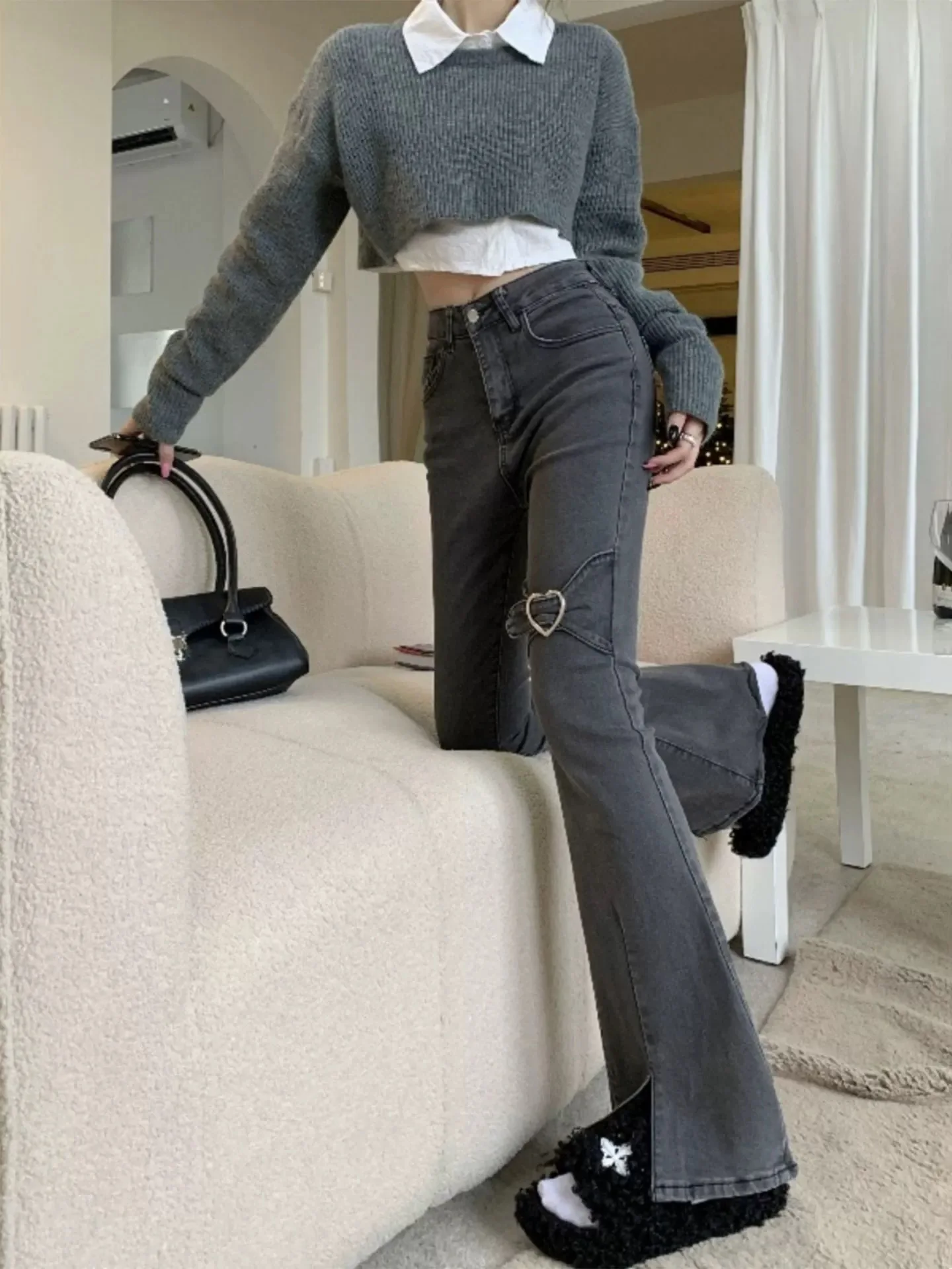 Cyflymder Autumn Split Pants Women Small Flared Design Black Gray High Waist Slimming Micro Flared Jeans New Style