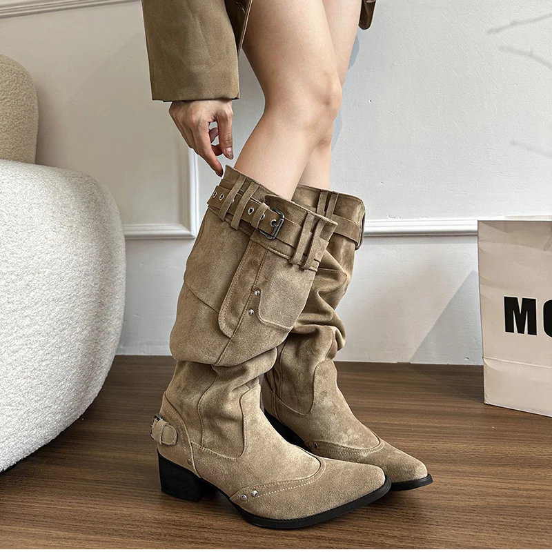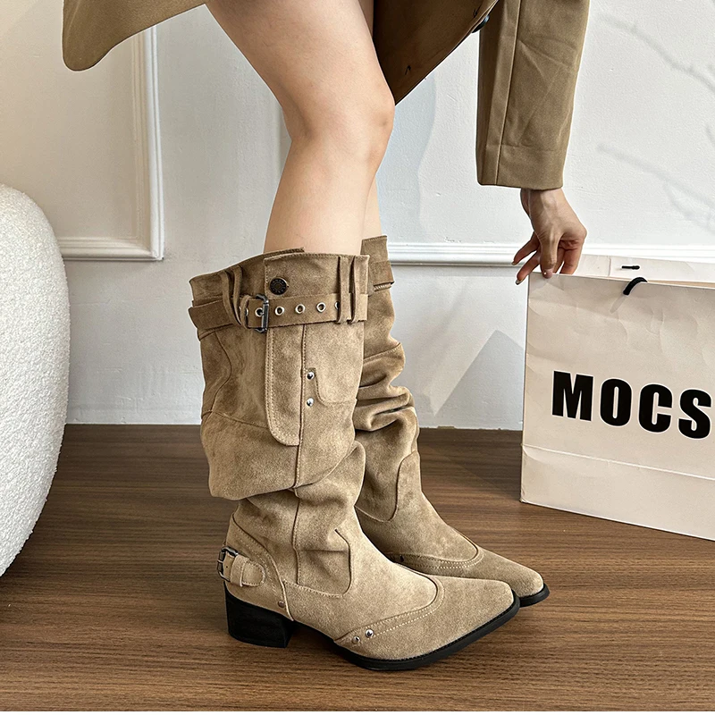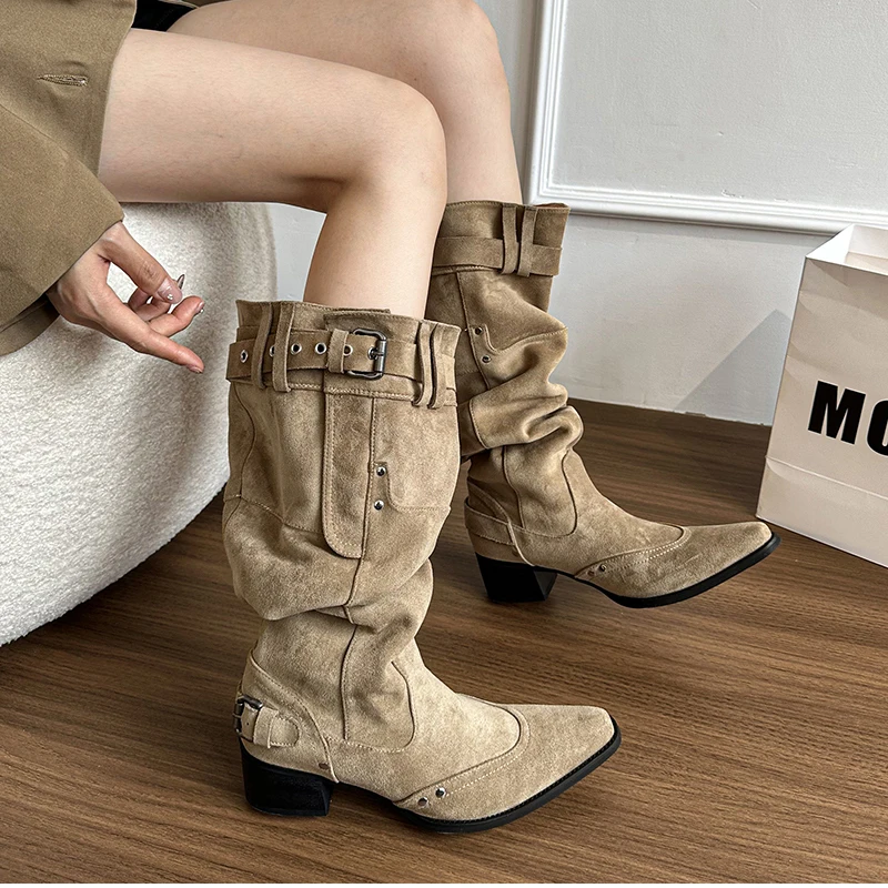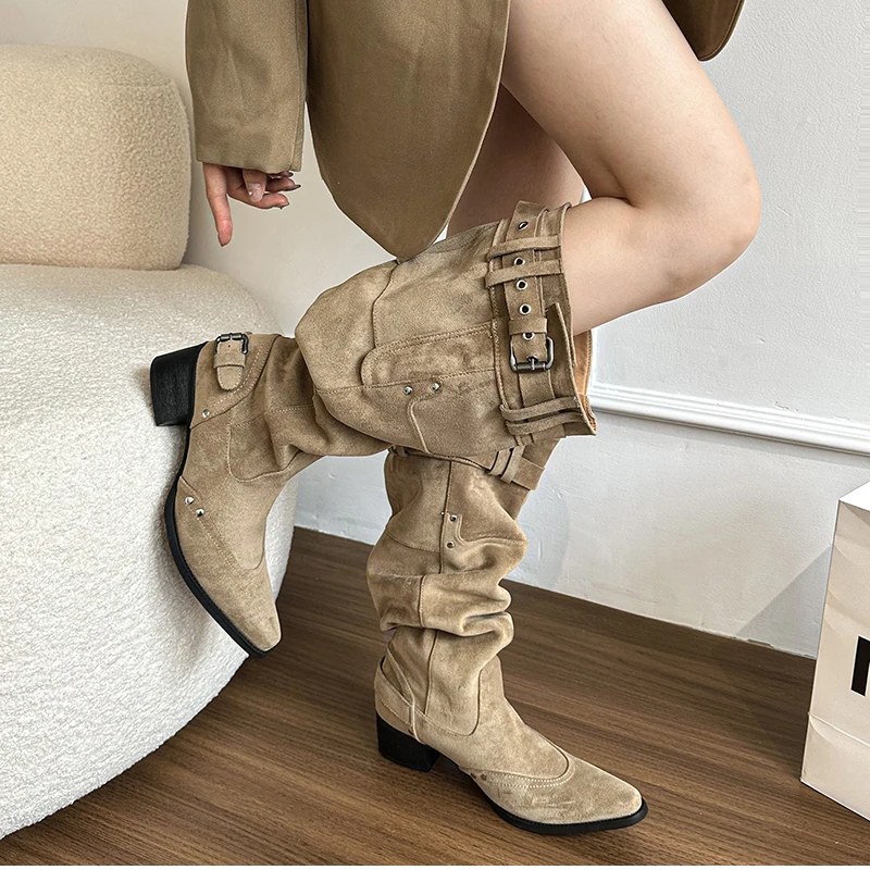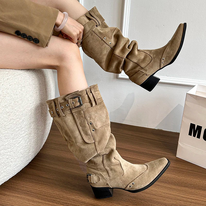 Cyflymder Autumn Winter Pleated Women Western Cowboy Boots Vintage Square Low Heels Shoes Female Belt Buckle Long Booties