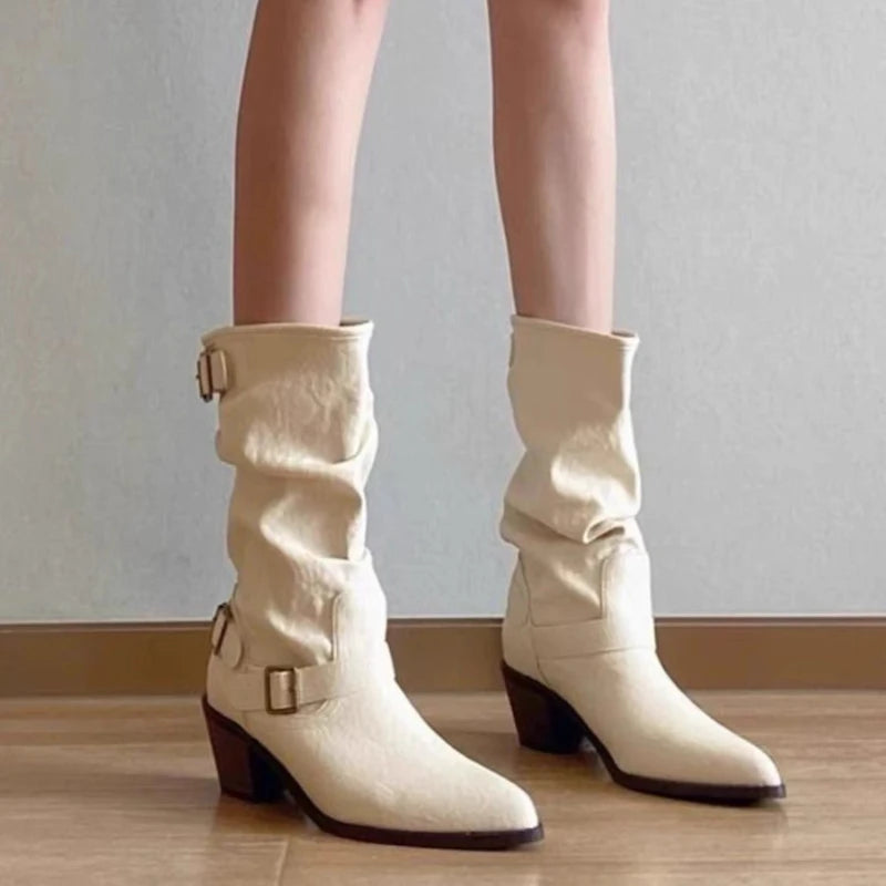Cyflymder Autumn Winter Vintage Thick Heel Women Western Cowboy Boots Slip On Belt Buckle Shoes Ladies Mid Calf Botas Zapatos De Mujer