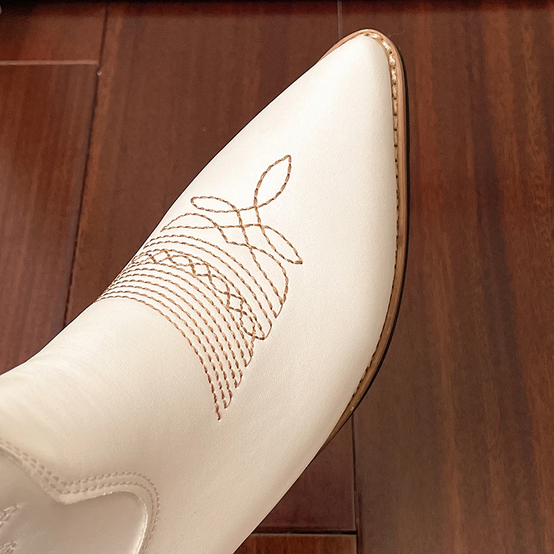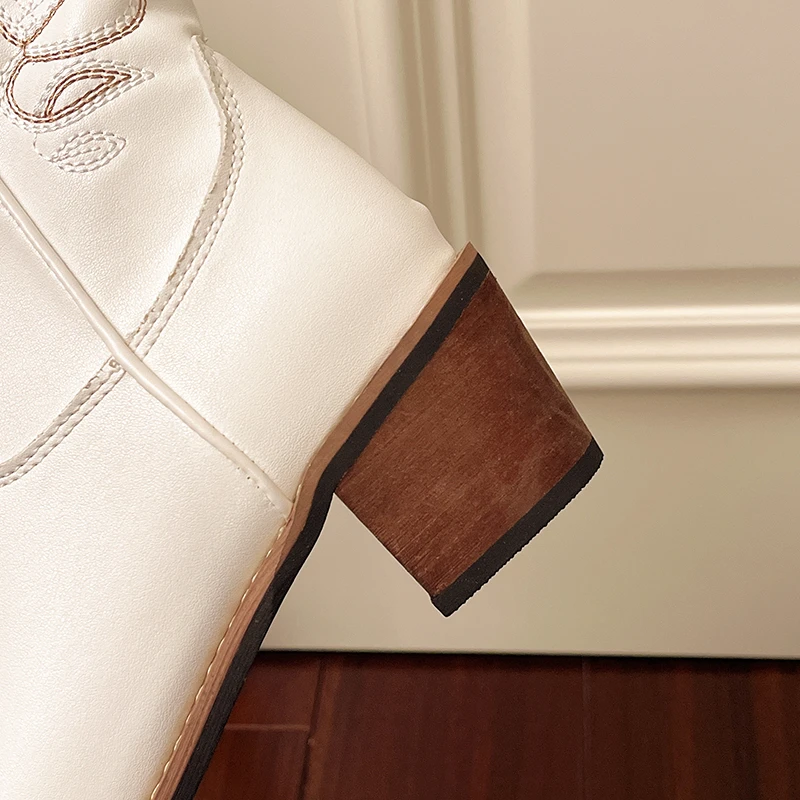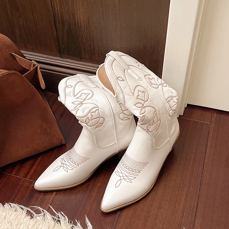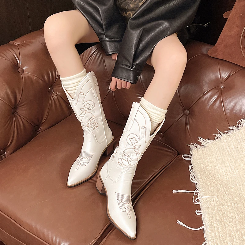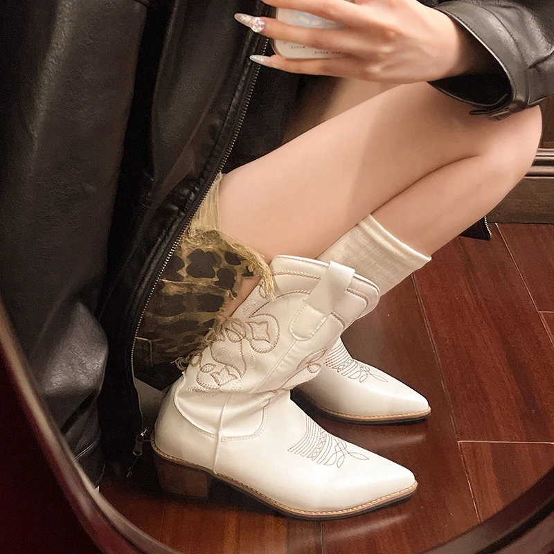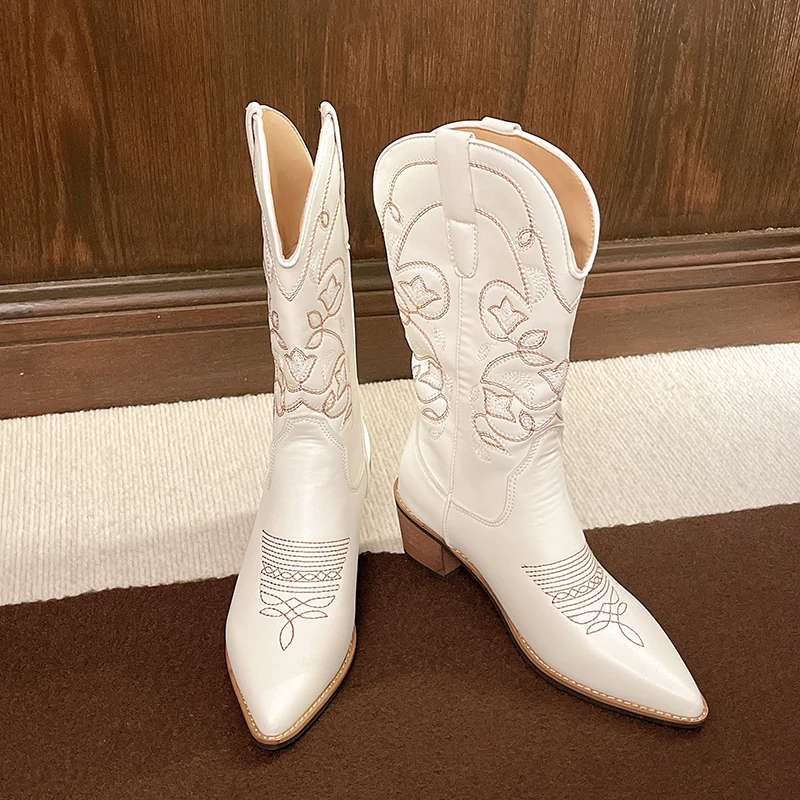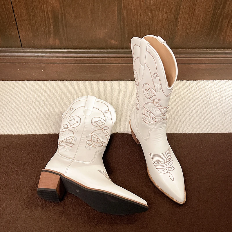 Cyflymder Autumn Winter Vintage Women Western Cowboy Boots Fashion Slip On Thick Heel Shoes Embroidery Knight Mid Calf Botas