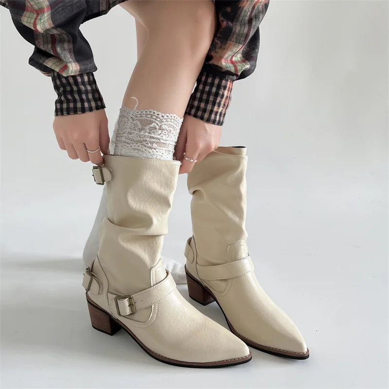 Cyflymder Autumn Winter Women Western Cowboy Boots Vintage Slip On Thick Heel Shoes Ladies Mid Calf Botas Zapatos De Mujer
