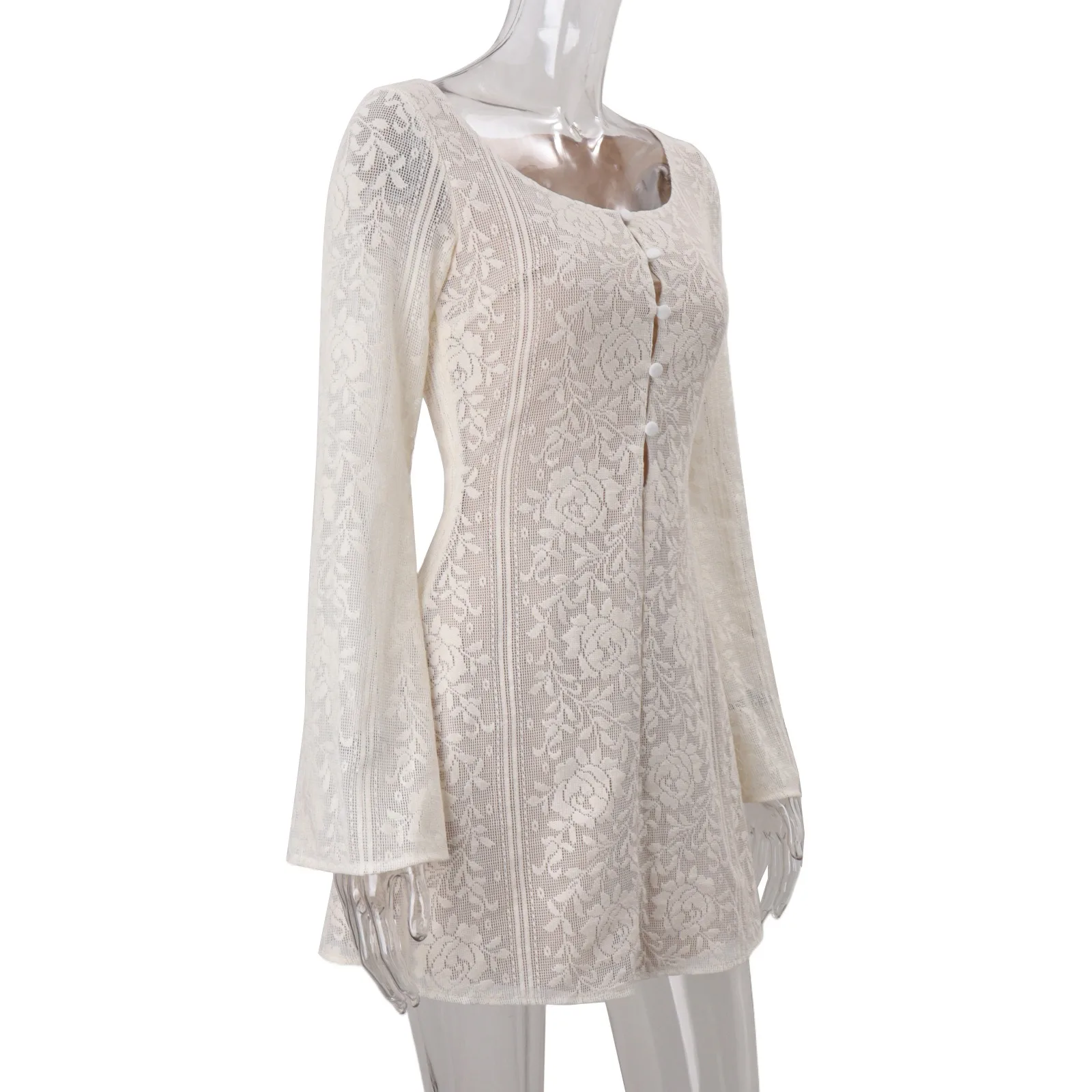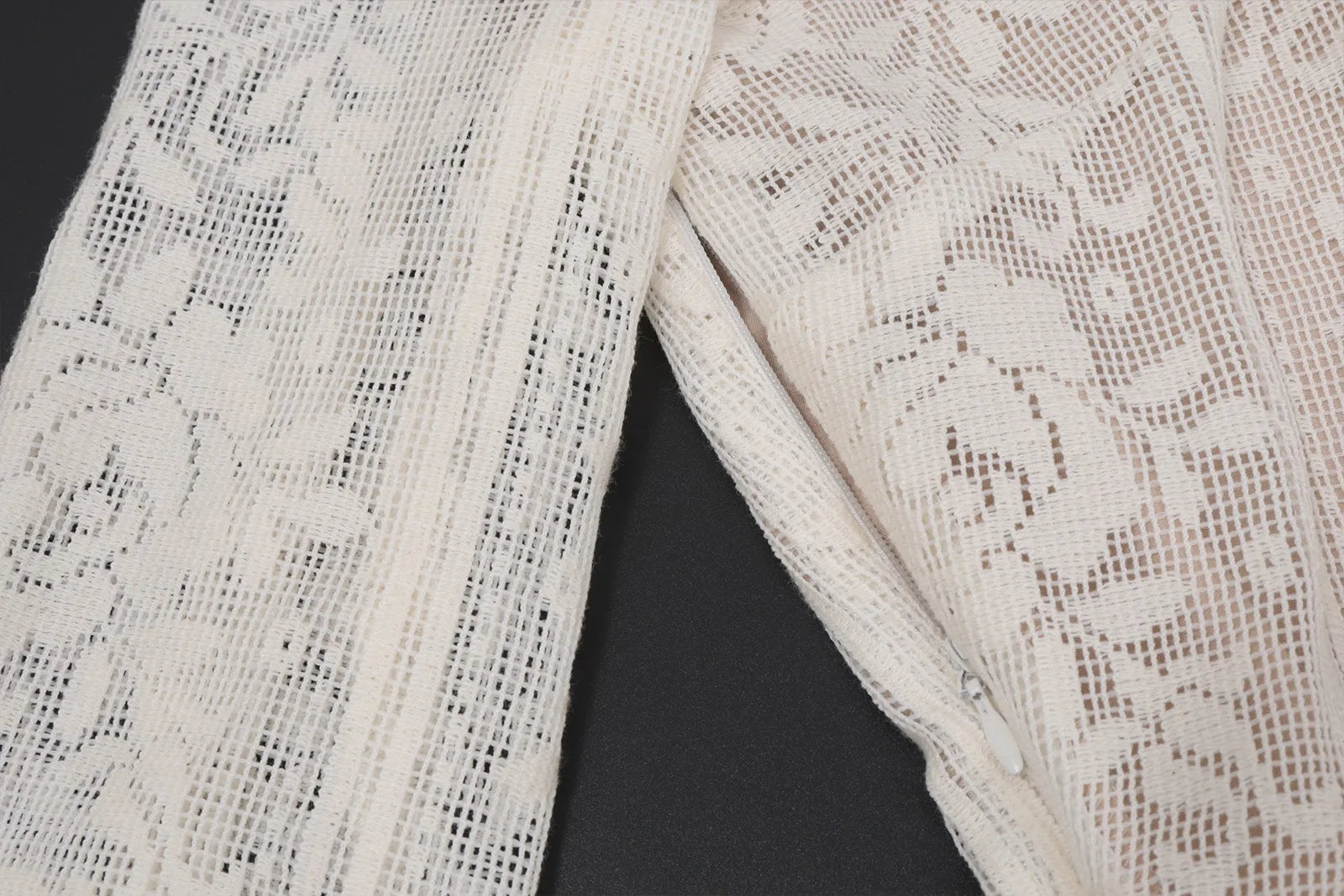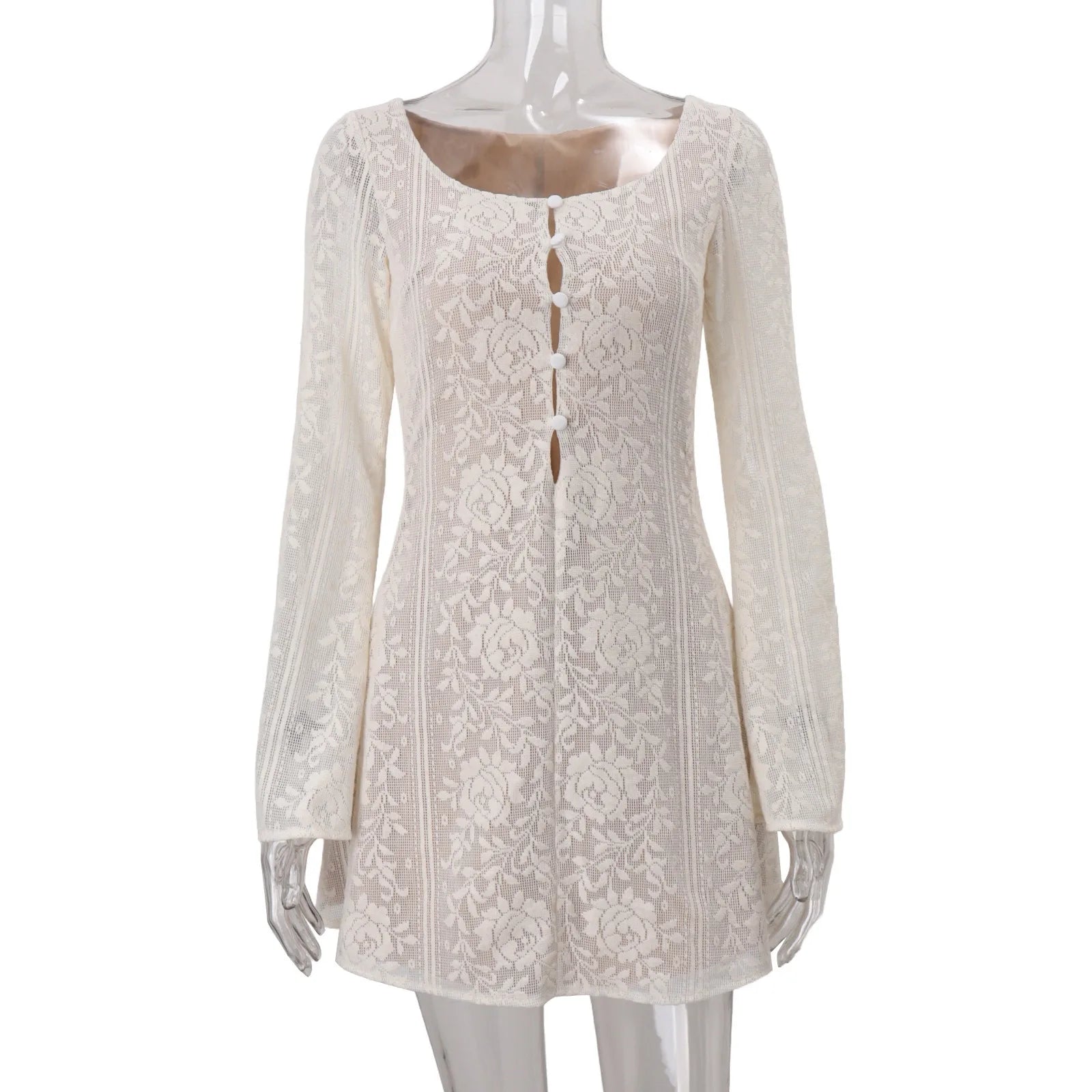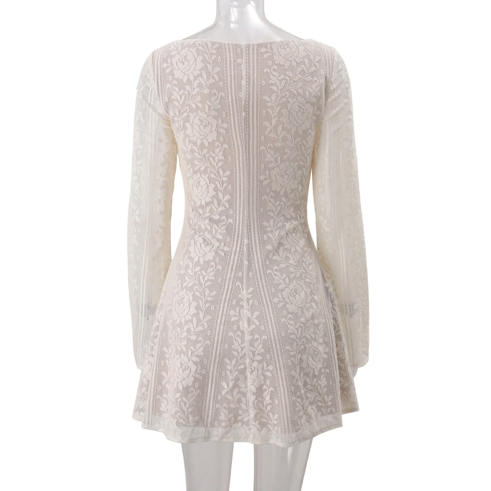 Cyflymder Autumn Women Floral Lace Patchwork U Neck Long Sleeve Bodycon Slim Waist Dress with Side Zipper