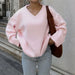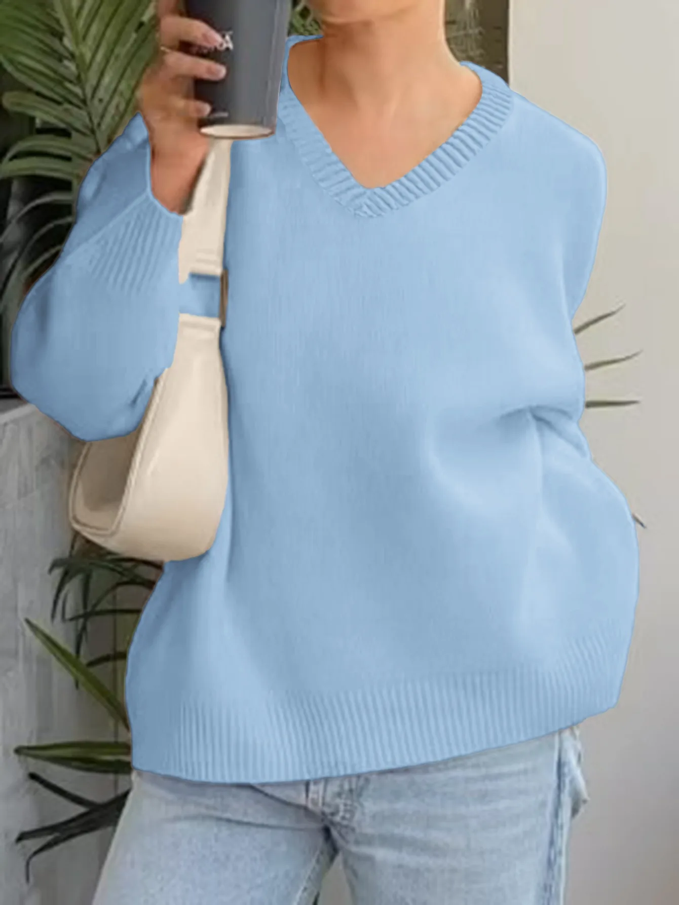 Cyflymder Autumn Women’s Loose Fit Casual Solid Color Long Sleeve V-Neck Knit Sweater Fashion Pullover Top