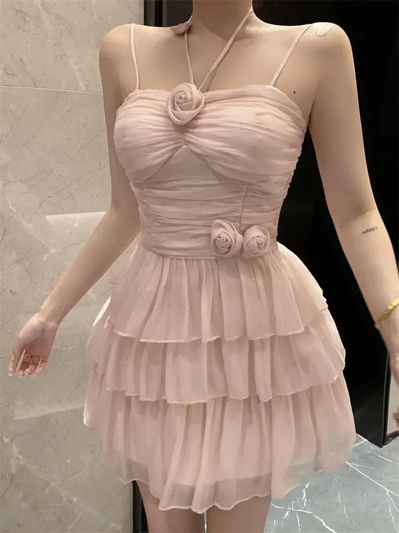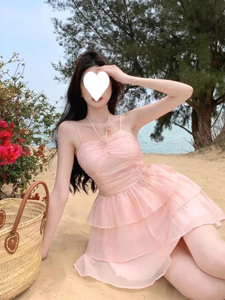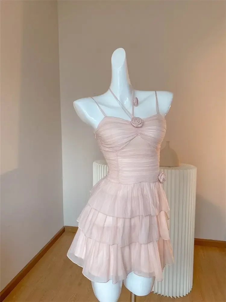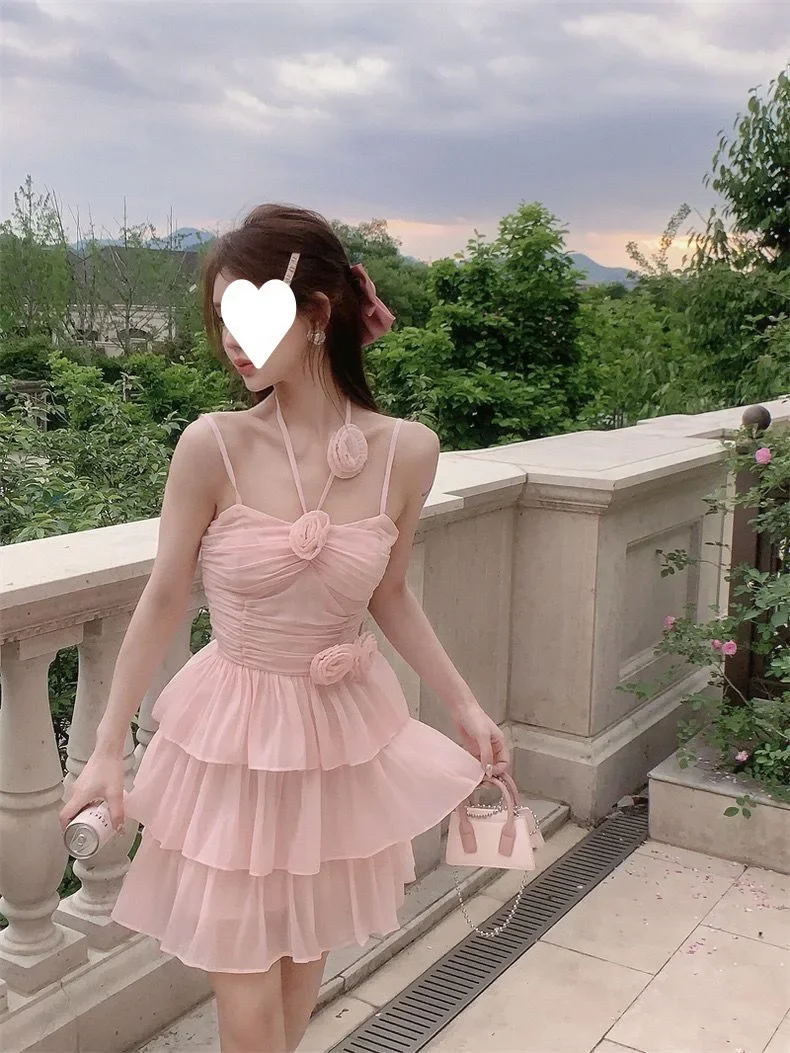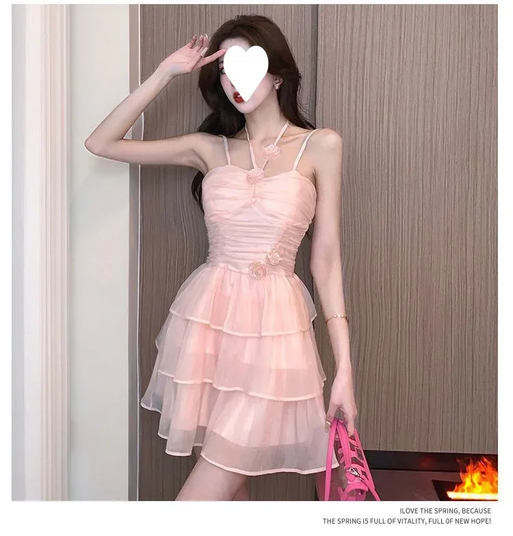Cyflymder Ballet Style Off-Shoulder Strap Dress Women's Summer New Waist-Cinching Slimming Heavy-Work Design Short Cake Skirt Dress