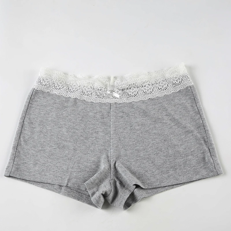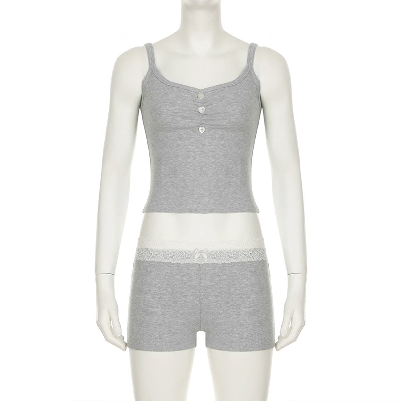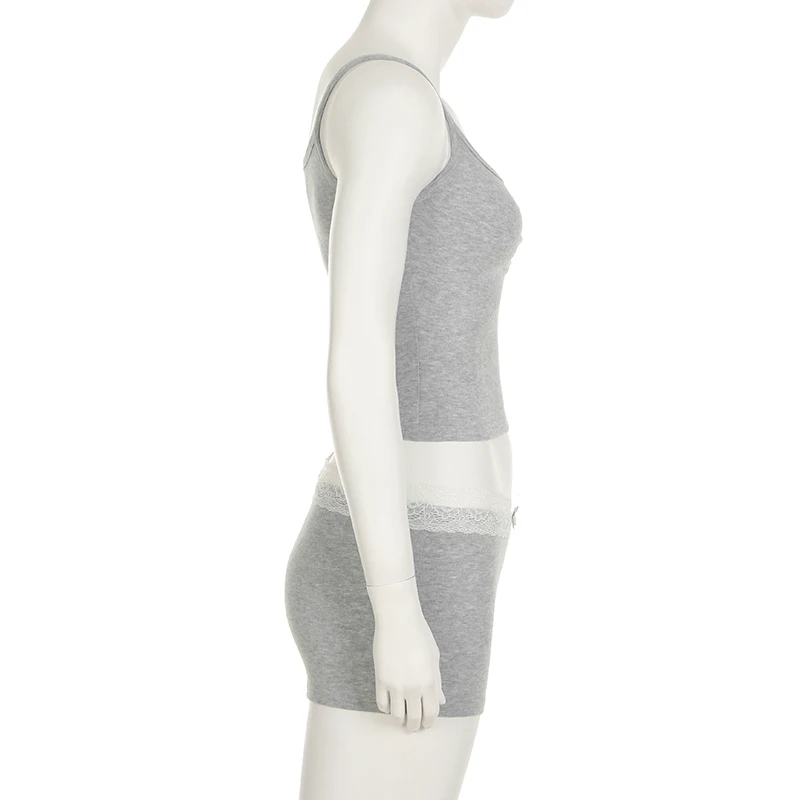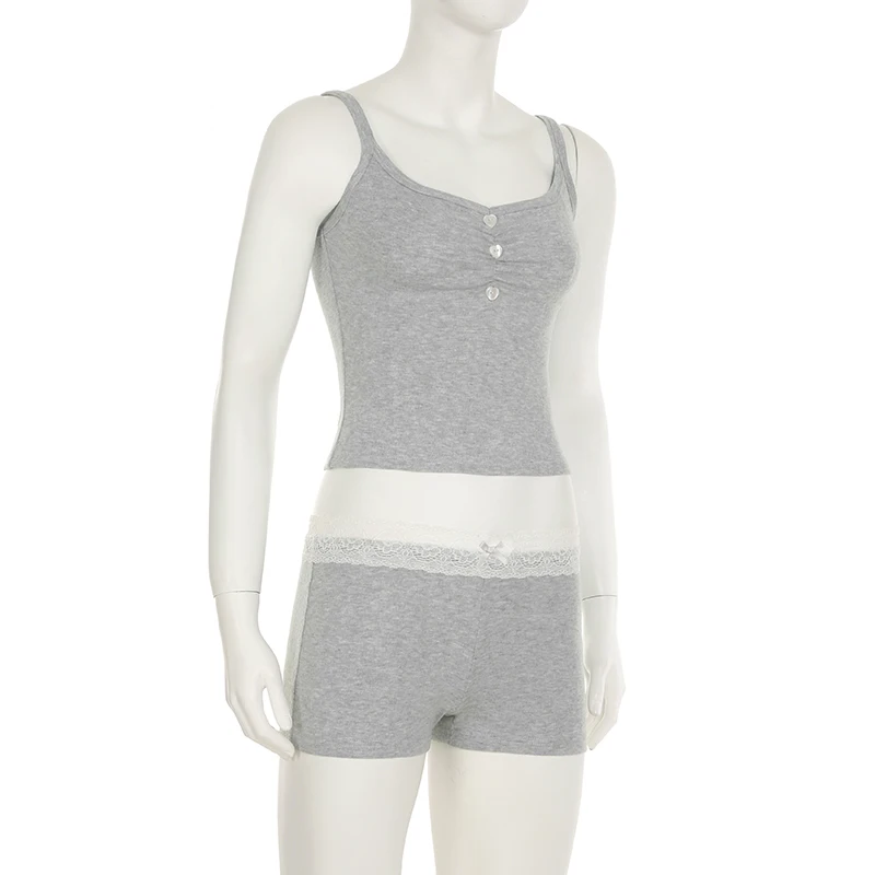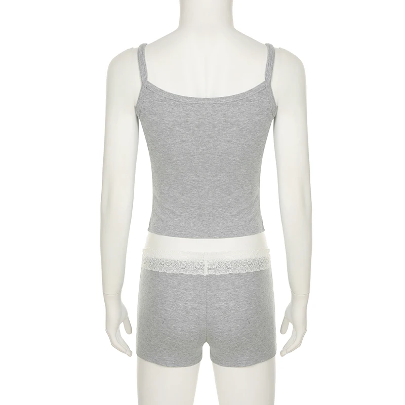 Cyflymder Basic Solid Shorts Sets Women Casual Slim 2 Piece Sets Slash Neck Folds Camis Tops Lace Trim Low-Waisted Shorts