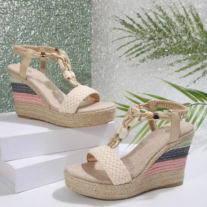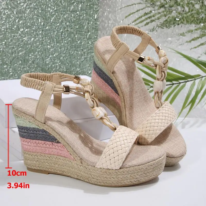 Cyflymder Bohemia Woven Strap Button Bead Decoration Sandals Women 2025 Summer Chunky Platform Wedge Heel Shoes Casual Hemp Sole Sandals