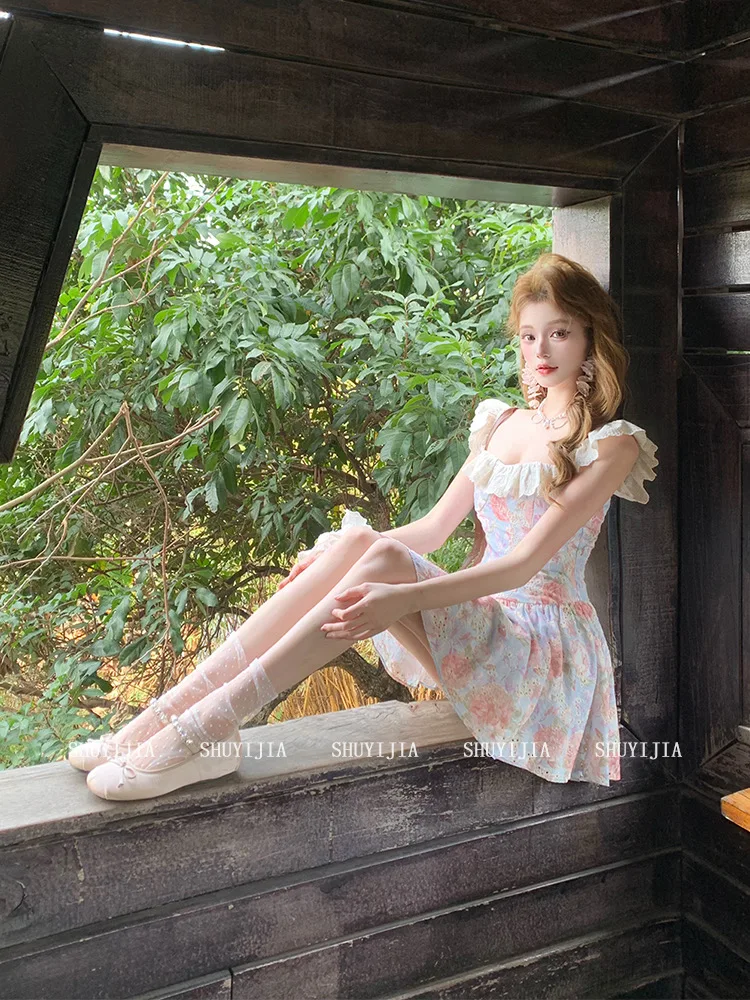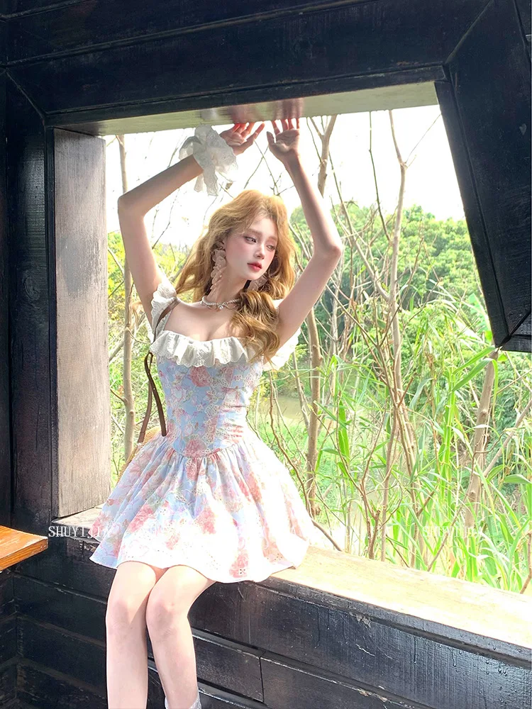 Cyflymder Boho Ruffles Prined Floral Mini Dress For Women Slim Fit Korean Fashion Holiday Beach Sexy Summer Dress Straps Cute Party Dress