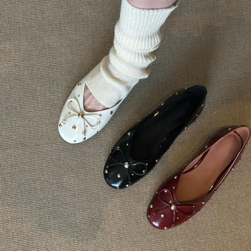 Cyflymder Bordered Rivets Pumps Bows Leather Round Toe Flat with Slip-On Fashion Concise Sweet Sexy Luxury Women Outdoor Shoes New