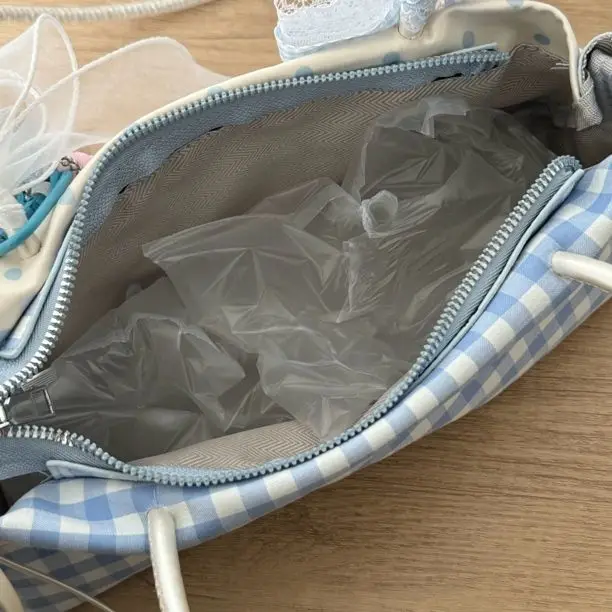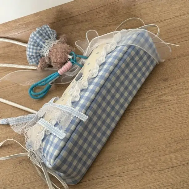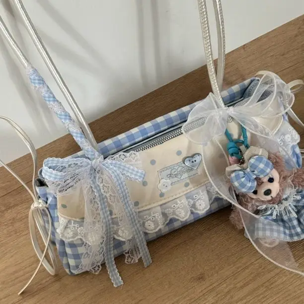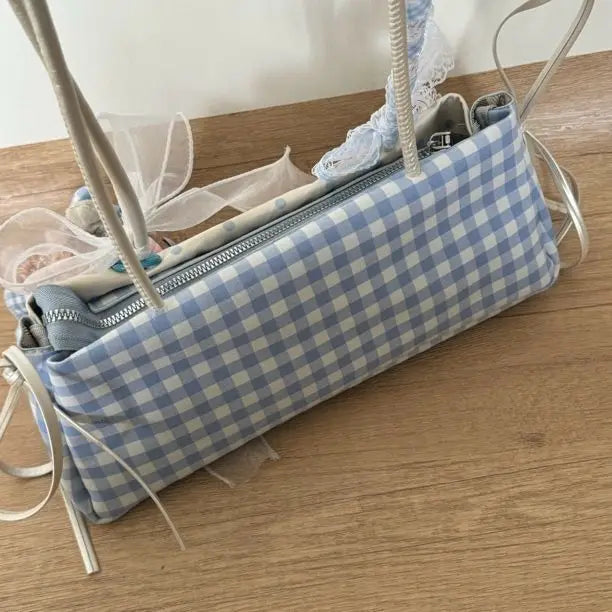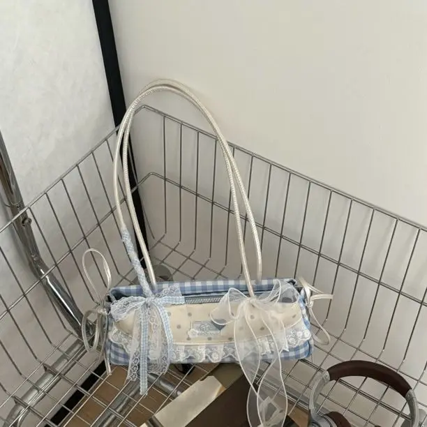 Cyflymder Bow Plaid Blue Purse Shoulder Bag Women Fairy Core Aesthetic Trendy Silk Ribbon Chic Y2k Handbag Ladies Sweet Cute Underarm Bag