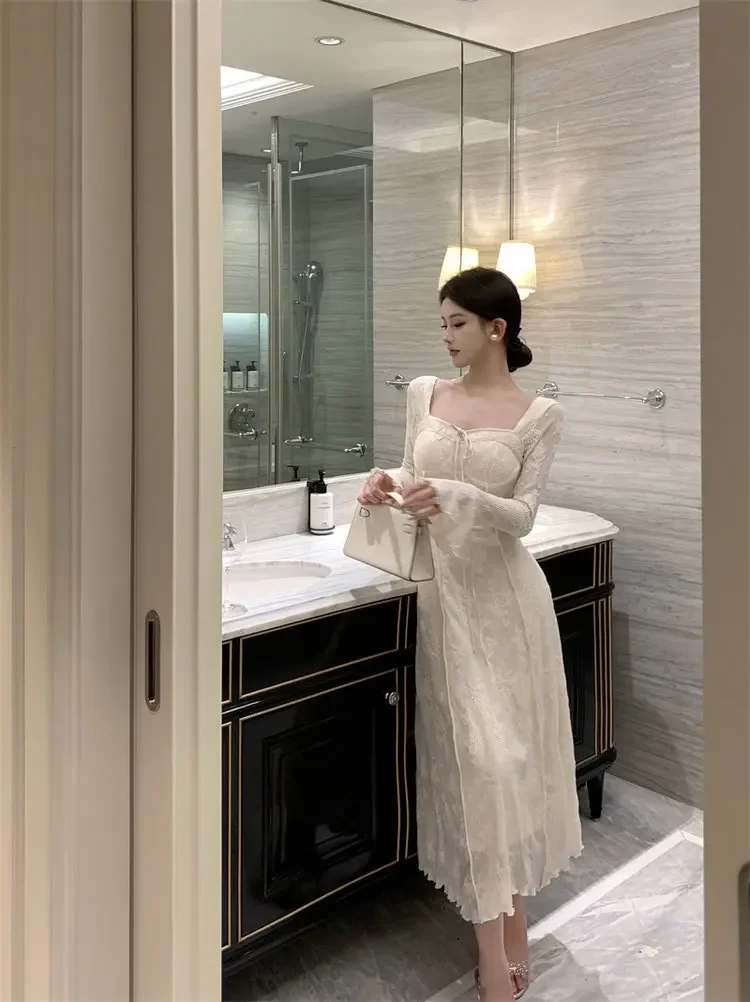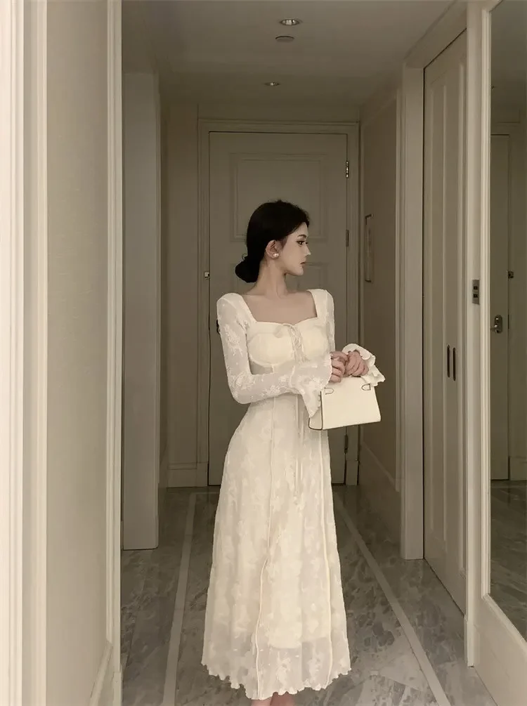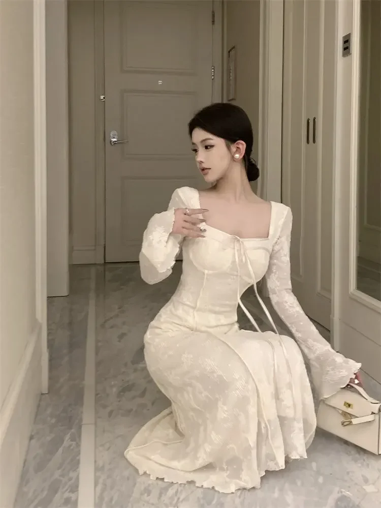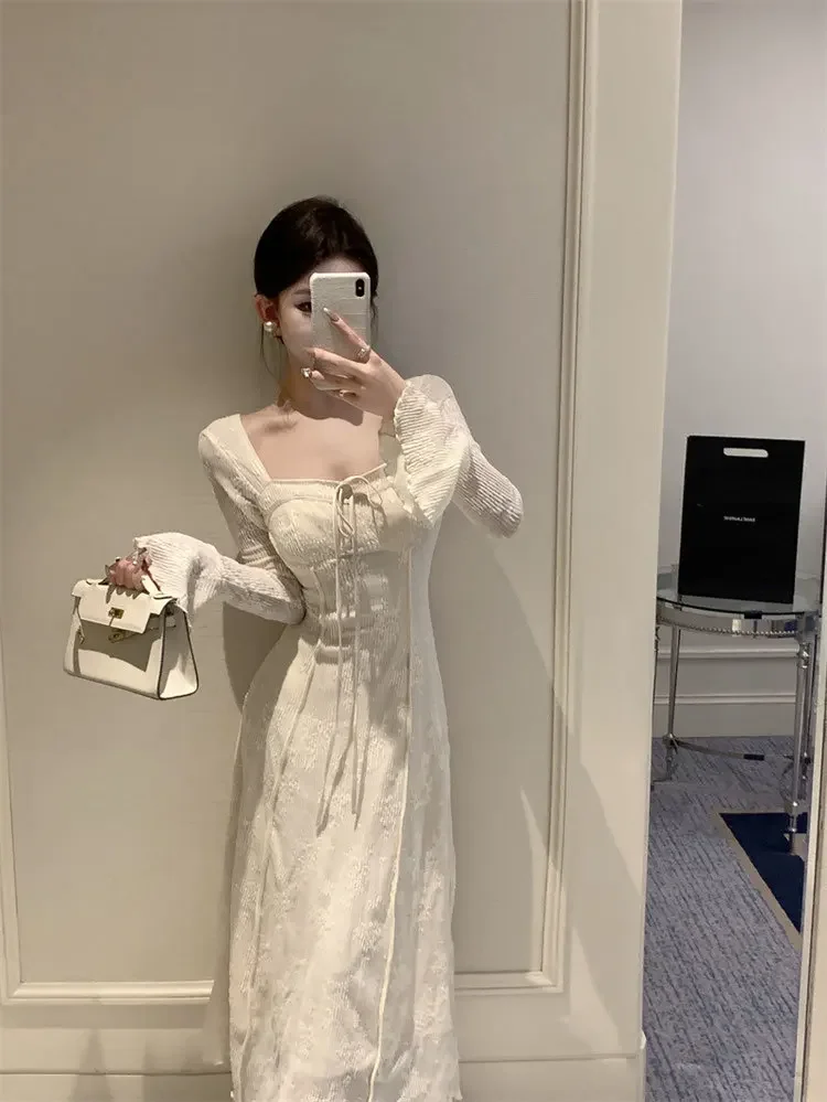 Cyflymder BowJacquard Square Collar Flare Sleeve Dress Women's Autumn/Winter Waist-Fitted Slimming New Chinese Style Soft Long Dress