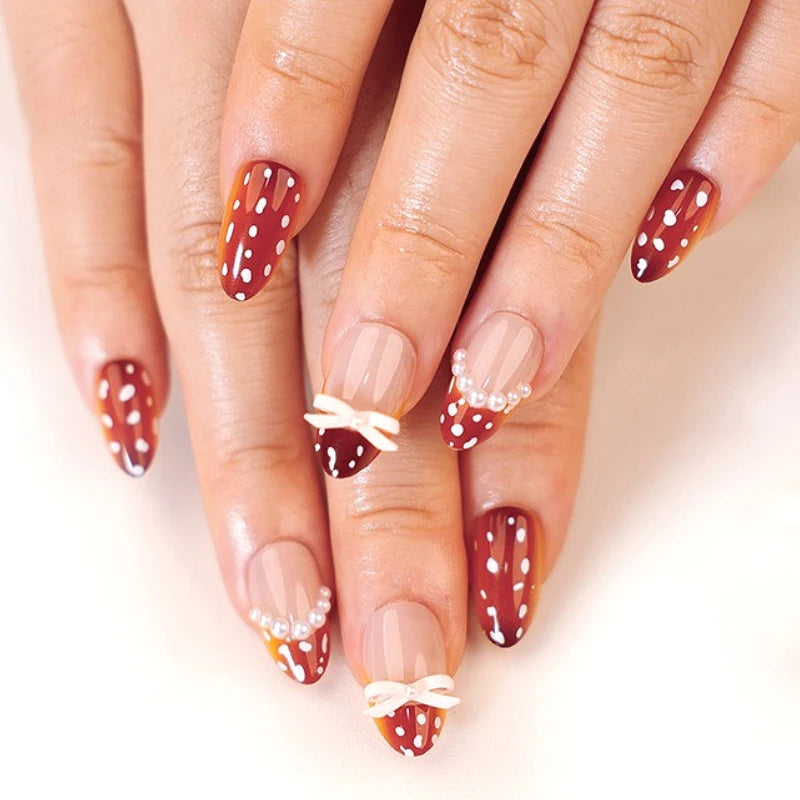 Cyflymder Bowknot Pearl French Brown Wearable Nail Art White Round Polka Dot Fake Nails Detachable Finished False Nails Press on Nails