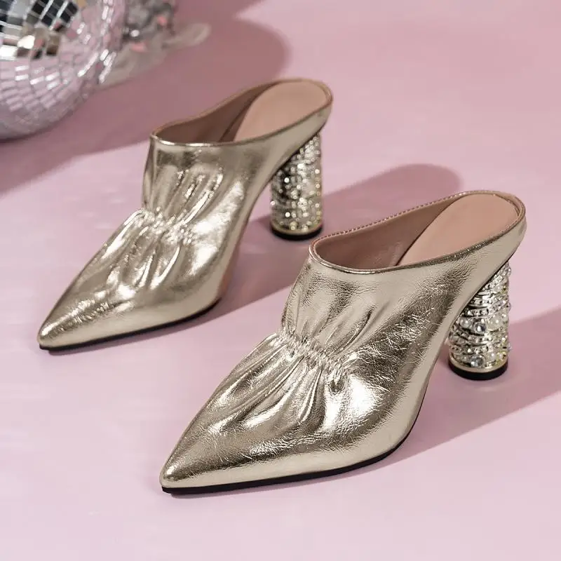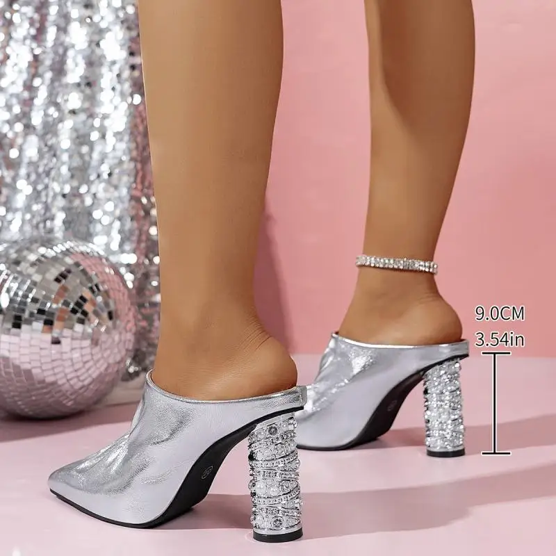 Cyflymder Brand Design Close Toe Gold Mules Slippers Women 2025 Summer Sexy Pointed Toe High Heel Sandals Fashion Silver Party Dress Shoes
