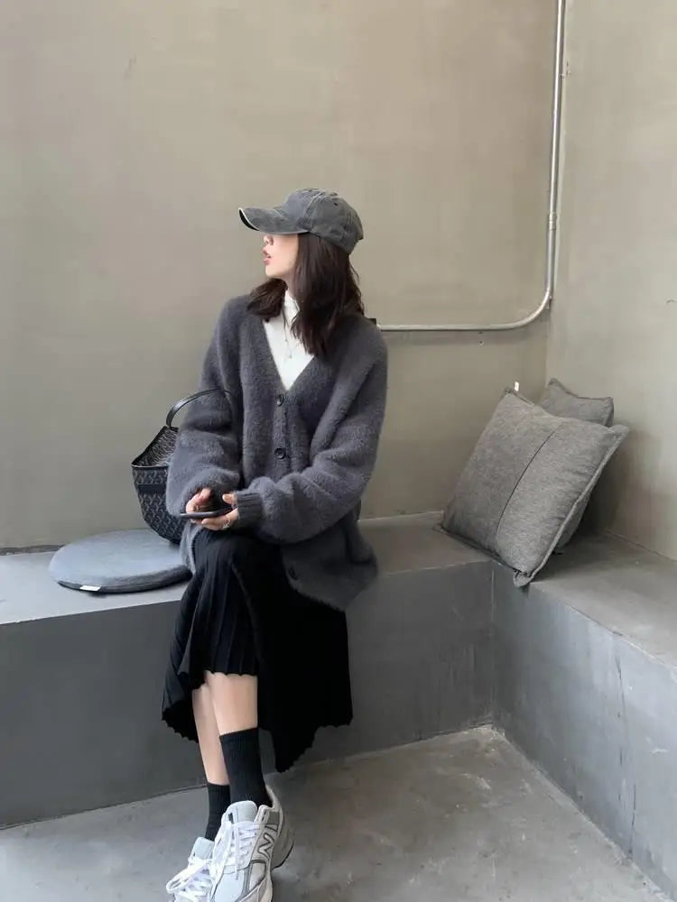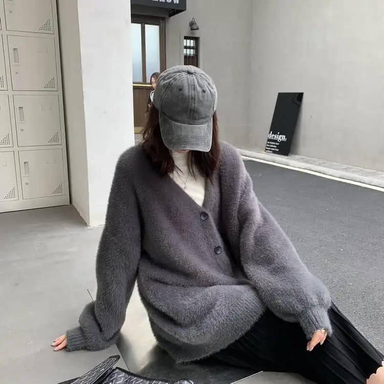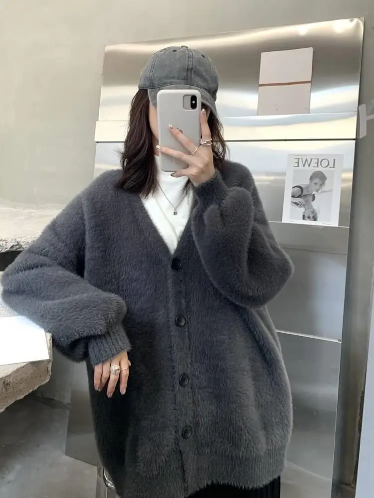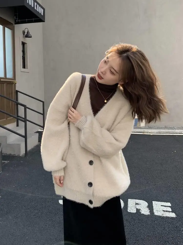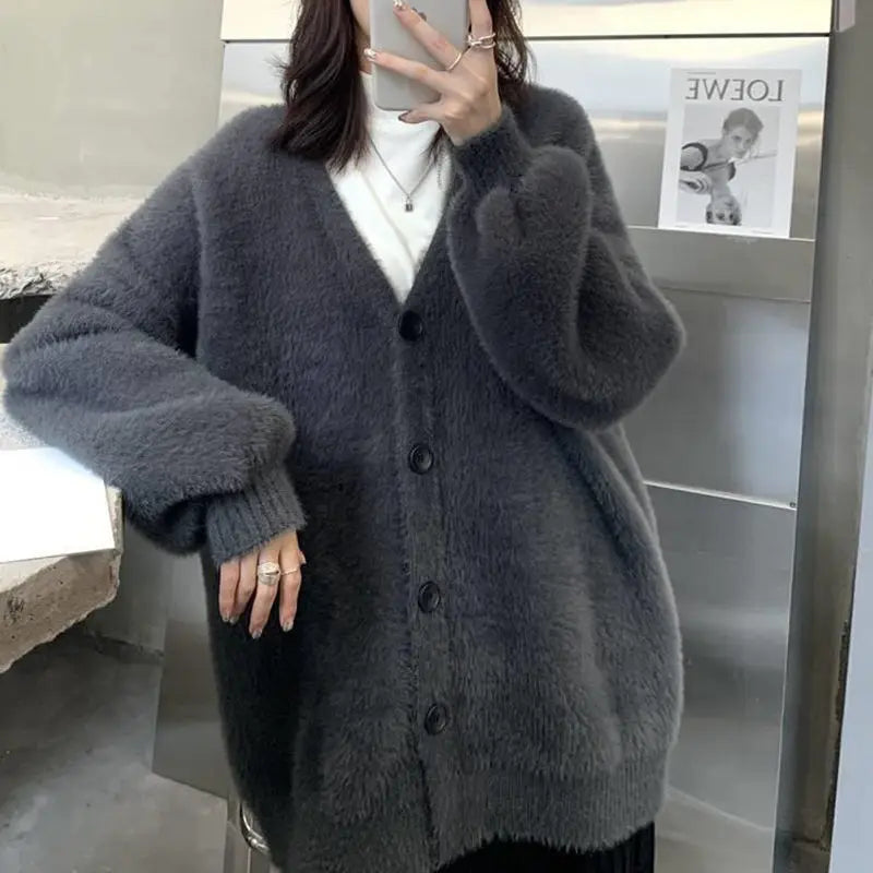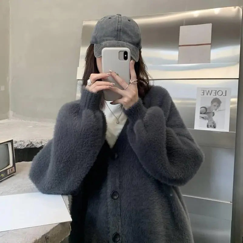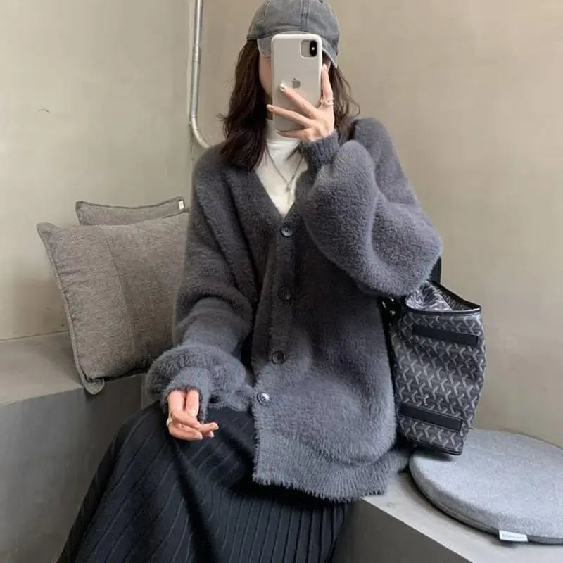 Cyflymder Cardigan Sweater Women V-neck Long Sleeve Top Solid Lazy Wind Soft Simple Warm Coat Vintage Single Breasted Knitwear Sweater