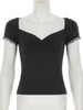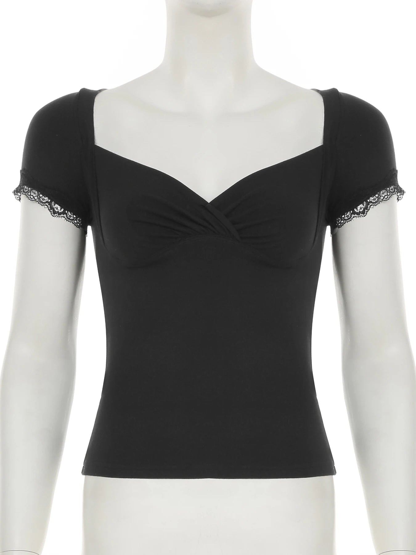 Cyflymder Casual Basic Lace Trim T Shirt Elegant Slim Folds Square Collar Short Sleeve Tees Women Summer Fashion Streetwear