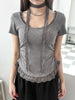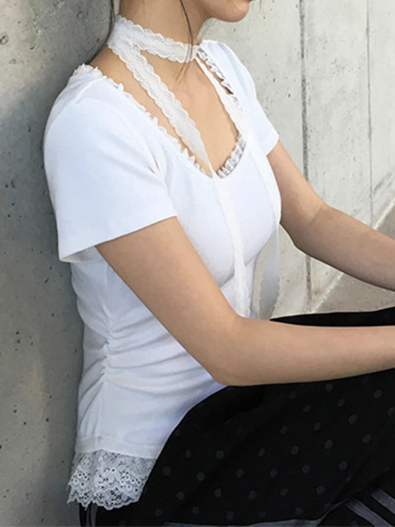 Cyflymder Casual Lace Trim Folds T Shirt With Scarf Sweet Slim Solid Square Collar Short Sleeve Tees Women 2025 Summer Fashion